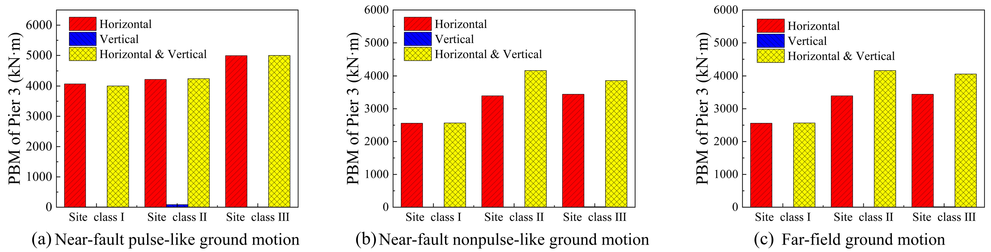 Figure 14, the bending moment at the pier base induced by vertical ground motions remains relatively small across all site classes and ground motion types. This response parameter is predominantly governed by horizontal ground motions and is also influenced by bidirectional seismic coupling effects. Soft and thick soil deposits (Site Class III) filter out high-frequency components and significantly amplify long-period content, resulting in comparatively higher bending moments in Site Class III than those in the other two site classes. Similarly, the pulse effect enriches the long-period components of ground motions, thereby amplifying structural responses. This behavior is consistent with the characteristic rightward shift and flattened decay of the response spectra observed for pulse-like ground motions.