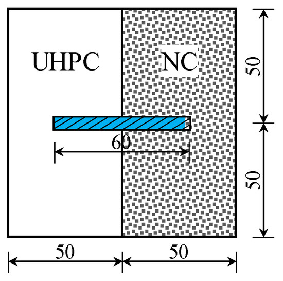 The specimen consisted of two 50 mm thick concrete blocks with an interface area of 100 mm × 100 mm. The diameter of the interface reinforcement was 8 mm, with a length of 60 mm. To ensure the same interface roughness, sandpaper was used to remove surface scale and impurities. The detailed dimensions of the specimen are presented in Figure 2.