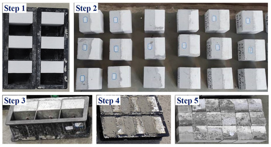 Specimens were prepared using a 100 mm × 100 mm × 100 mm standard cubic mould, with the specific preparation steps as follows (Figure 3):
