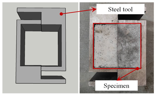 A shear tool was designed for interface shear testing. The raw material for the shear test tool was Q235 steel. To eliminate shear slip and inaccurate load measurement caused by shear box deflection, a whole-cut manufacturing process was used. The tool’s design and picture are presented in Figure 4.