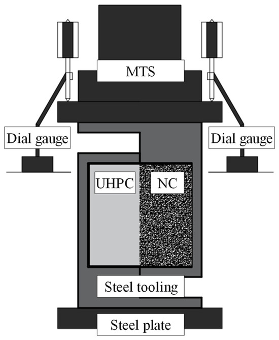 Direct shear tests were conducted using an MTS electro-hydraulic servo universal testing machine (MTS Systems, Eden Prairie, MN, USA). To measure the relative slip of UHPC-NC interfaces during shear testing, dial gauges were symmetrically positioned on the top surface of the specimen. The test specimen, with dry, ground, and cleaned surfaces, was assembled with the steel tool and positioned on the steel plate at the centre of the testing machine. Rigorous centring was performed to ensure accurate and stable loading.