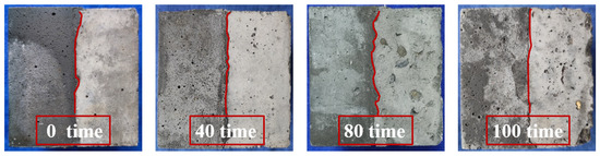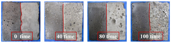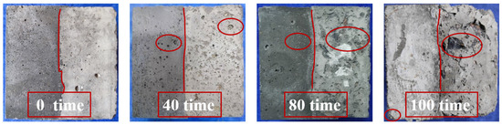 The apparent damage modes of the straight shear specimens with embedded reinforcement under salt freeze–thaw cycles are presented in Figure 6, Figure 7 and Figure 8.