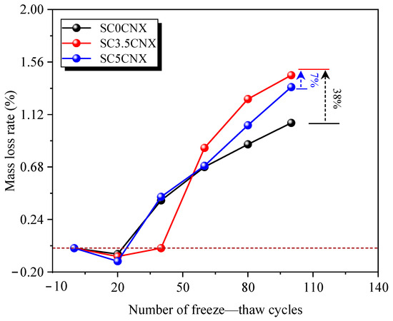 Mass loss rate under freeze–thaw cycles of the specimens.