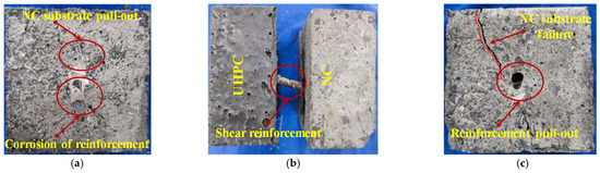 In this study, the primary damage to the specimens occurred within the NC substrate layer, while the UHPC overlay remained largely intact. This phenomenon indicated that the shear strength at the UHPC-NC interface was primarily dominated by the mechanical performance of the NC part. Since the UHPC-NC interface in the specimens was not roughened, the cohesive strength at the interface was low, with shear resistance primarily provided by the dowel action of the reinforcement. However, the reinforcement could only contribute to shear capacity without inhibiting crack propagation. The failure mode of specimens was consequently mainly characterised by failure within the interface transition zone (ITZ). Notably, with increasing salt freeze–thaw cycles, no separation or loosening of the reinforcement within the UHPC side was observed in any specimen. Failure occurred either within the NC substrate or exhibited as reinforcement pull-out. The failure modes primarily included the following three types: