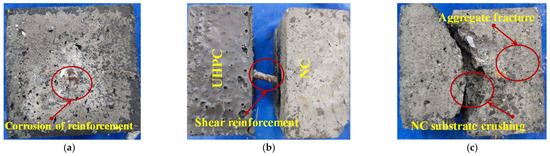 - NC substrate failure (Mode C). As illustrated in Figure 12, this failure mode can be characterised by shear fracture or damage occurring within the coarse aggregate on the NC side or at the mortar–aggregate interface transition zone, with the overall failure behaviour close to brittle fracture. As the number of salt freeze–thaw cycles increased, the strength of the NC substrate gradually decreased, ultimately falling below the bond strength at the UHPC-NC interface. Hence, the NC substrate was crushed by the shear reinforcement before any significant damage occurred at the interface. The failure process for this mode was as follows: When the ultimate load reached 80–95%, transverse cracks began to form within the NC substrate and propagated rapidly, accompanied by tearing sounds. The interface bond failed at the ultimate load with a loud bang.