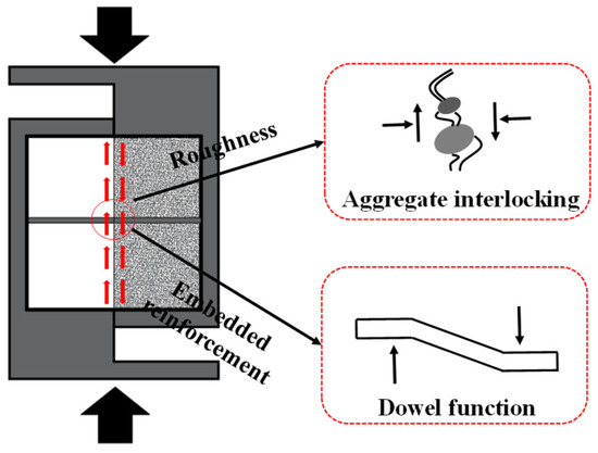 Ultra-high-performance concrete (UHPC), with excellent compressive strength, ductility, and durability, has become a highly promising material for repairing and strengthening existing concrete structures [1,2,3,4,5]. A prevalent application involves casting a UHPC overlay onto a normal concrete (NC) substrate to form composite structures (such as reinforced concrete bridge deck strengthening layers), which significantly enhances structural load-bearing capacity [6], fatigue resistance [7], and service life [8]. The integrity and load transfer efficiency of such composite systems fundamentally depend upon the shear resistance at the interface between the UHPC overlay and the NC substrate [9,10,11].