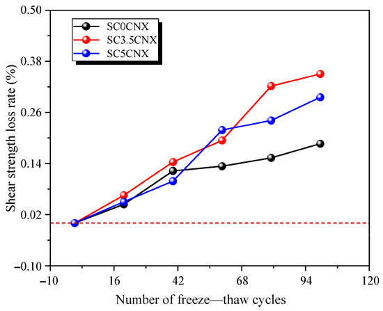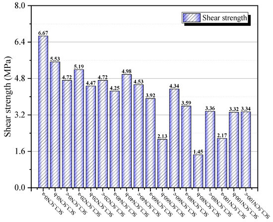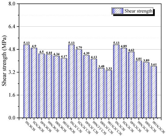 The average shear strength test results for each group of specimens are shown in Figure 14. The degradation rates of shear strength after 20 freeze–thaw cycles were 4%, 7%, and −5% for the SC0CN20, SC3.5CN20, and SC5CN20 groups, respectively. The degradation rates for the SC0CN40, SC3.5CN40, and SC5CN40 groups after 40 cycles were 12%, 14%, and 10%, respectively. The degradation rates for the SC0CN60, SC3.5CN60, and SC5CN60 groups after 60 cycles were 13%, 19%, and 22%, respectively. Following 80 cycles, the degradation rates for the SC0CN80, SC3.5CN80, and SC5CN80 groups were 15%, 32%, and 24%, respectively. The degradation rates for the SC0CN100, SC3.5CN100, and SC5CN100 groups at 100 cycles were 19%, 35%, and 30%, respectively. It is worth noting that the strength loss rate of SC5CN60 group (22%) was slightly higher than that of the SC3.5CN60 group (19%) at 60 freeze–thaw cycles. However, from the overall trend of the whole freeze–thaw process (0 to 100 cycles), the strength loss rate of the SC3.5CNX group was significantly higher than those of the other two groups during most cycles (especially at the two key durability milestones of 80 and 100 cycles). Especially after 100 cycles, the strength loss rate of the SC3.5CN100 group (35%) was significantly higher than that of SC5CN100 group (30%). In summary, the influence of chloride salt concentration on interfacial shear strength could be ranked as follows: 0% < 5% < 3.5%.