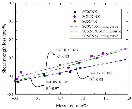 To quantitatively evaluate the degradation law of UHPC-NC interface performance under freeze–thaw cycles, a fitting model between mass loss rate and interfacial shear strength loss rate is established in this section, as shown in Figure 17. The experimental data from different working conditions all exhibit a strong linear relationship between these two parameters, with the fitting curves achieving correlation coefficients (R2) exceeding 0.9, indicating statistically significant reliability of the proposed model.