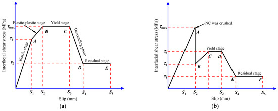 I-type load–slip curves can be divided into five distinct stages: the elastic stage, the elastic–plastic stage, the yield stage, the descending stage, and the residual stage. The critical values corresponding to the five stages were cracking shear strength (τ1), cracking slip (S1), peak shear strength (τmax), peak slip (Smax), residual shear strength (τ2), and residual slip (S4).