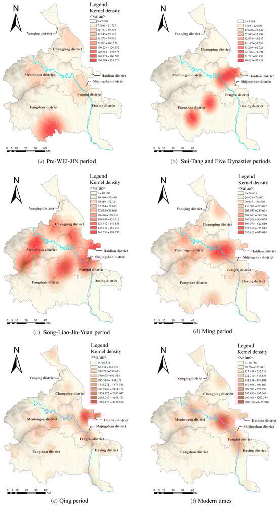 Kernel Density Map of Water Heritages for Different Periods. Map was generated using ArcGIS10.8 (www.esri.com/software/arcgis), drawn by the authors.
