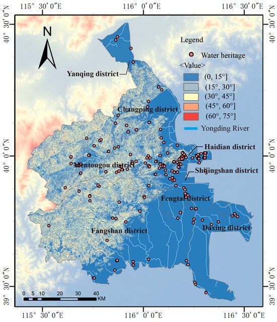 The slope distribution of water heritage sites in the Xishan–Yongding River cultural belt is characterized by “concentrated gentle slopes and sparse steep slopes”. Of these, 218 water heritage sites are located within the (0, 15°] slope range, accounting for 83.85% of the total (Figure 11). This distribution results from the interaction between natural geographical conditions (such as the gentle slopes of the alluvial fan and the meandering river course), human survival needs (agricultural irrigation, flood protection), and historical engineering limitations. This pattern, together with the elevation analysis showing that 85.38% of the sites are in the (0–500] m range, confirms the spatial feature of “dense water heritage in lowland areas” []. Both the Dragon King’s Temple and the ancient bridge in Jiuyuan Village are located in the low-lying areas of the settlement. At the same time, the water flow is stable in the areas with gentler slopes, making it easier to build and maintain water facilities over the long term. Given this spatial distribution, flood control and disaster management should be prioritized. Lowland areas are vulnerable to flooding threats, making it essential to improve drainage and irrigation systems, strengthen the flood control capacity of embankments, preserve natural flood discharge areas, and enhance monitoring and protection of key heritage sites.