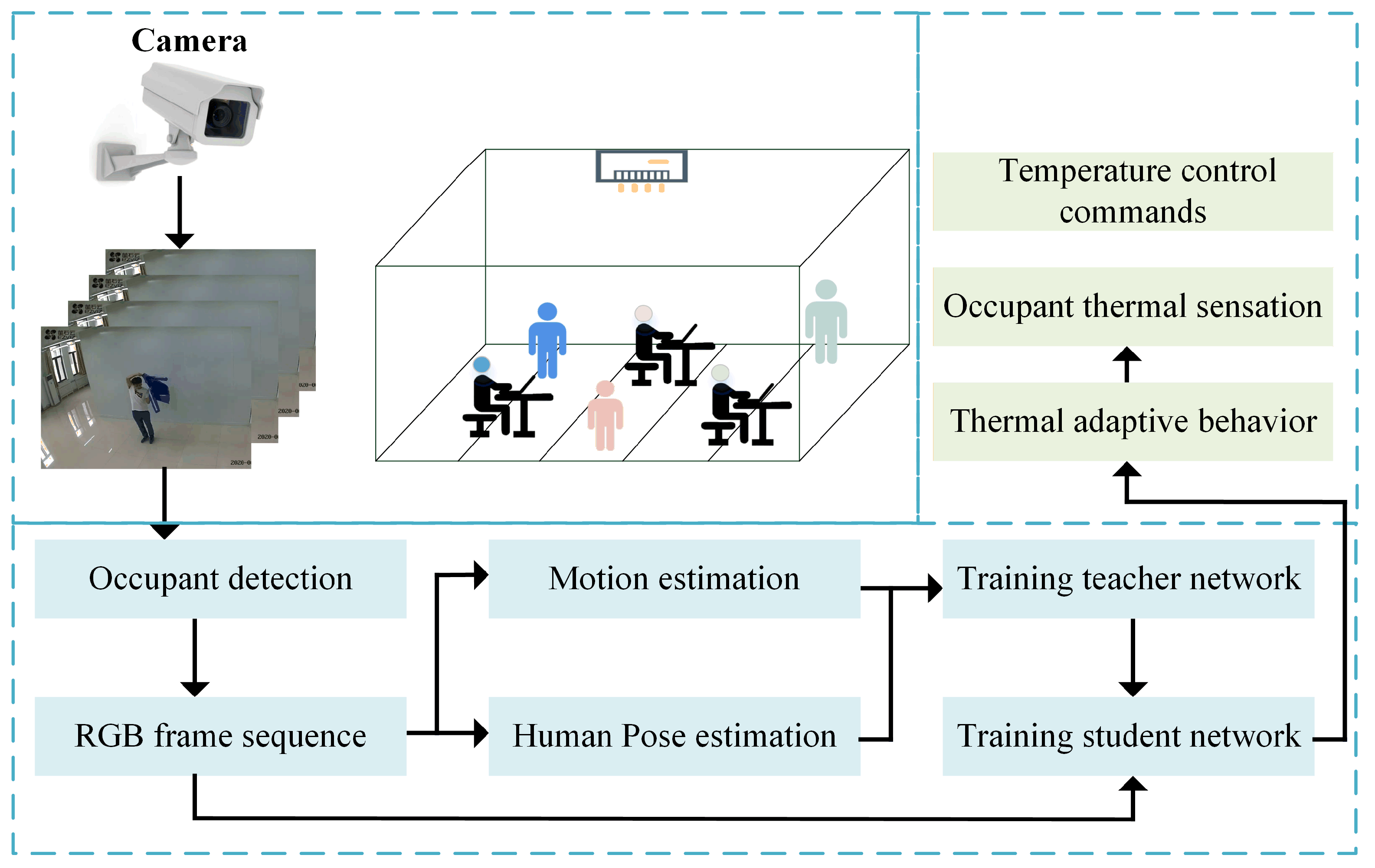 The method proposed in this study is a preliminary exploration of the terminal deployment of thermal adaptation behavior-recognition models. We aimed to establish a thermal adaptation behavior-recognition framework using knowledge distillation technology. On the basis of ensuring a lightweight model, multi-modal features can still be utilized to improve the recognition accuracy, which enables the model to meet the dynamic environmental temperature needs of multiple people in open-plan offices. This study examined the application of this framework in specific scenarios, with a focus on thermal adaptation behavior-recognition accuracy and the lightweighting of the model. Although the theoretical framework is still in its early stages and faces practical challenges, this study was committed to finding solutions. The main contributions of this study can be summarized as follows: