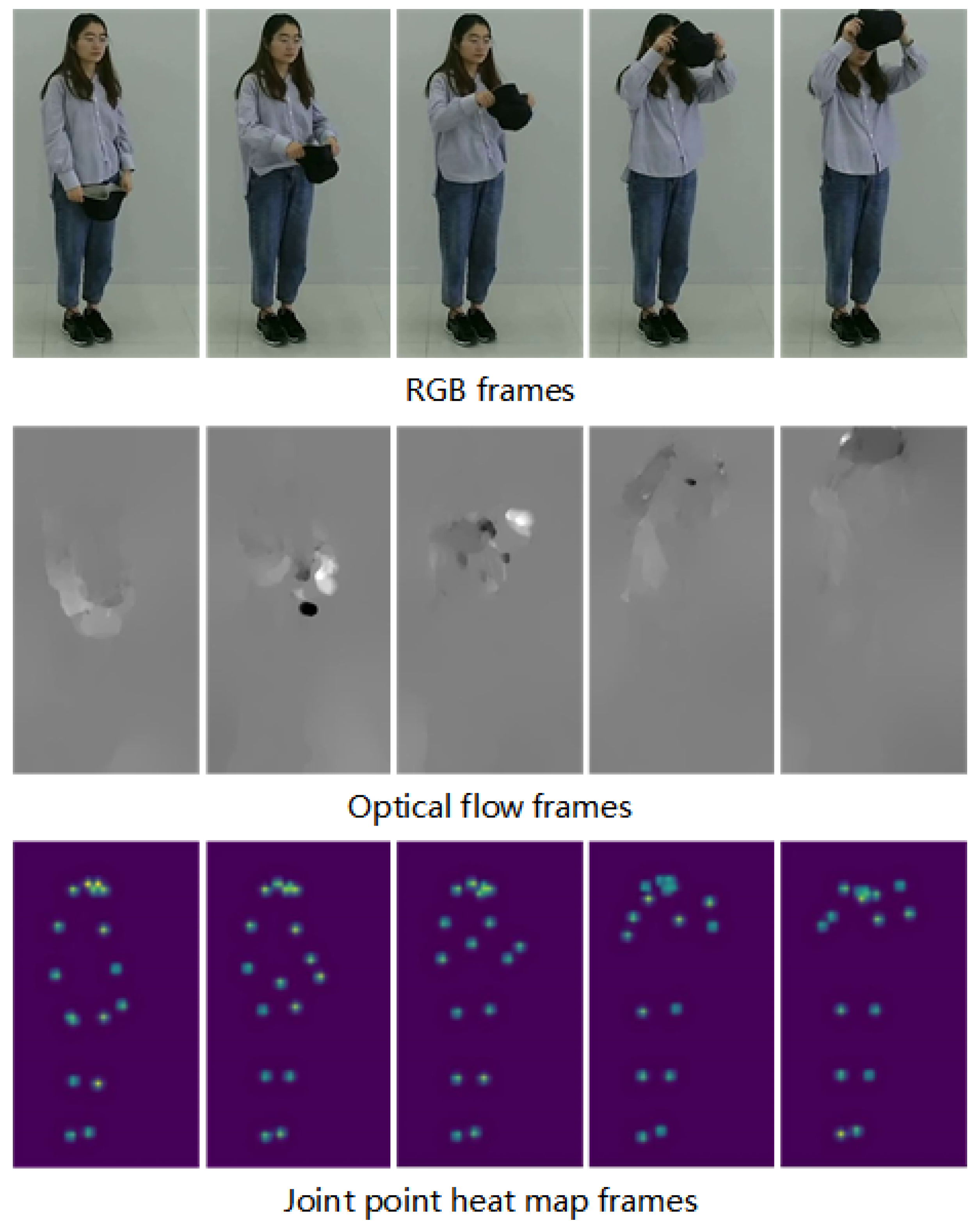 Sample frames of the dataset. The three rows show the RGB frames, TV-L1 optical flow frames, and joint heat map frames from HRNet pose estimation, respectively.