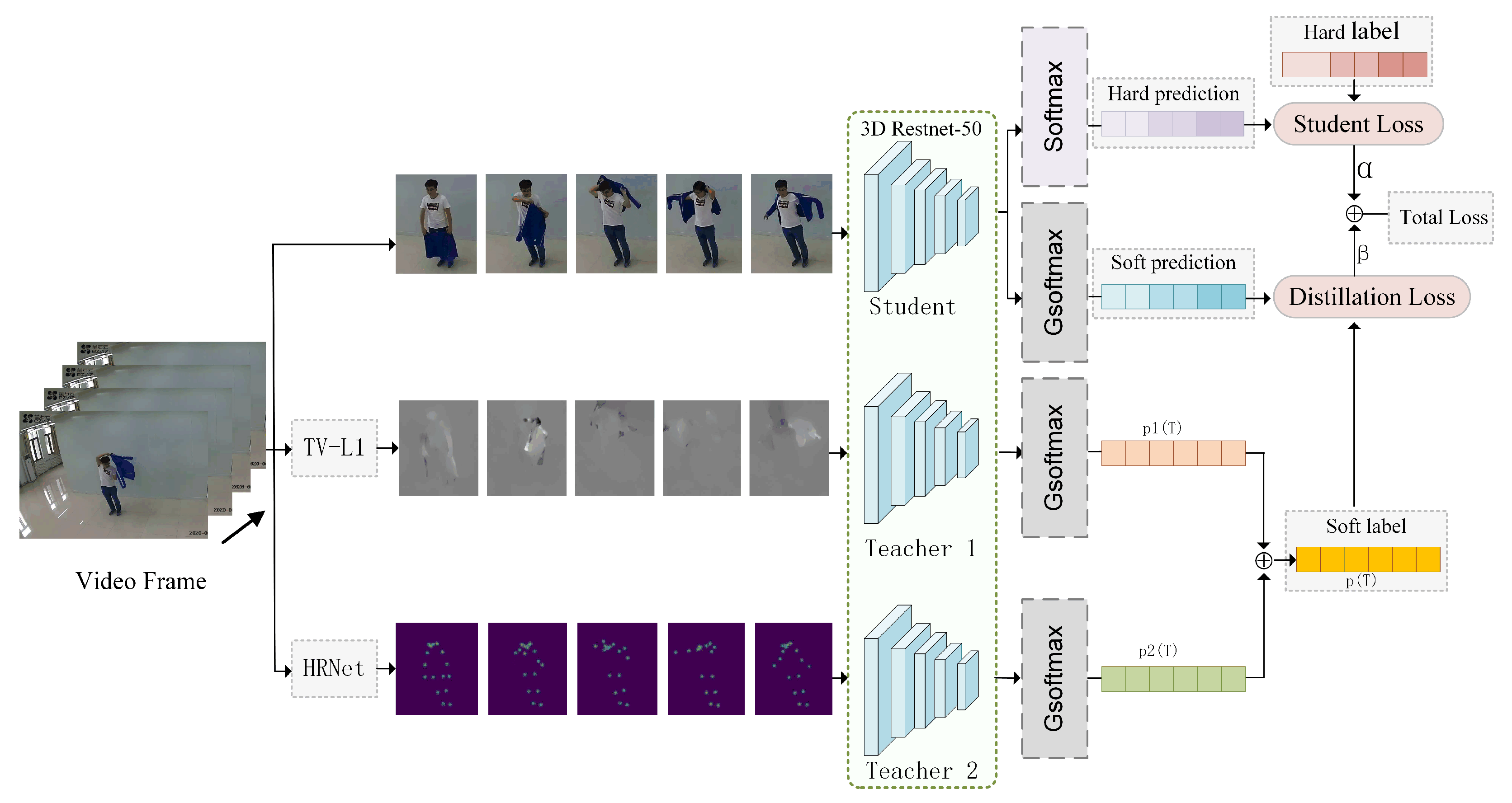 As a result, there is a growing trend toward integrating complementary information from multi-modal data to create a more robust and efficient model for recognizing heat-adaptive behaviors. Wang et al. proposed a thermal adaptive action-recognition method that integrates three data modalities: RGB, optical flow, and joint heat maps. Three dedicated networks were set up for the recognition of each data stream, demonstrating that the model has a high recognition accuracy. This model retains the integrity of information from each modality through parallel processing and result fusion. It performs exceptionally well in scenarios where the explicit utilization of heterogeneous features is required, but it has a high computational cost and is not conducive to deployment at the terminal level. On this basis, we propose a knowledge distillation model that utilizes bone and heat map information as the source domains and RGB data as the target domain. Through the distillation loss function mechanism, key information—such as the motion patterns in optical flow and bone structure features—are distilled into the RGB representation. Because of this, a single network can learn the unified features contained in the rectified RGB modal data, realize feature homogeneity, and reduce the computational overhead.
