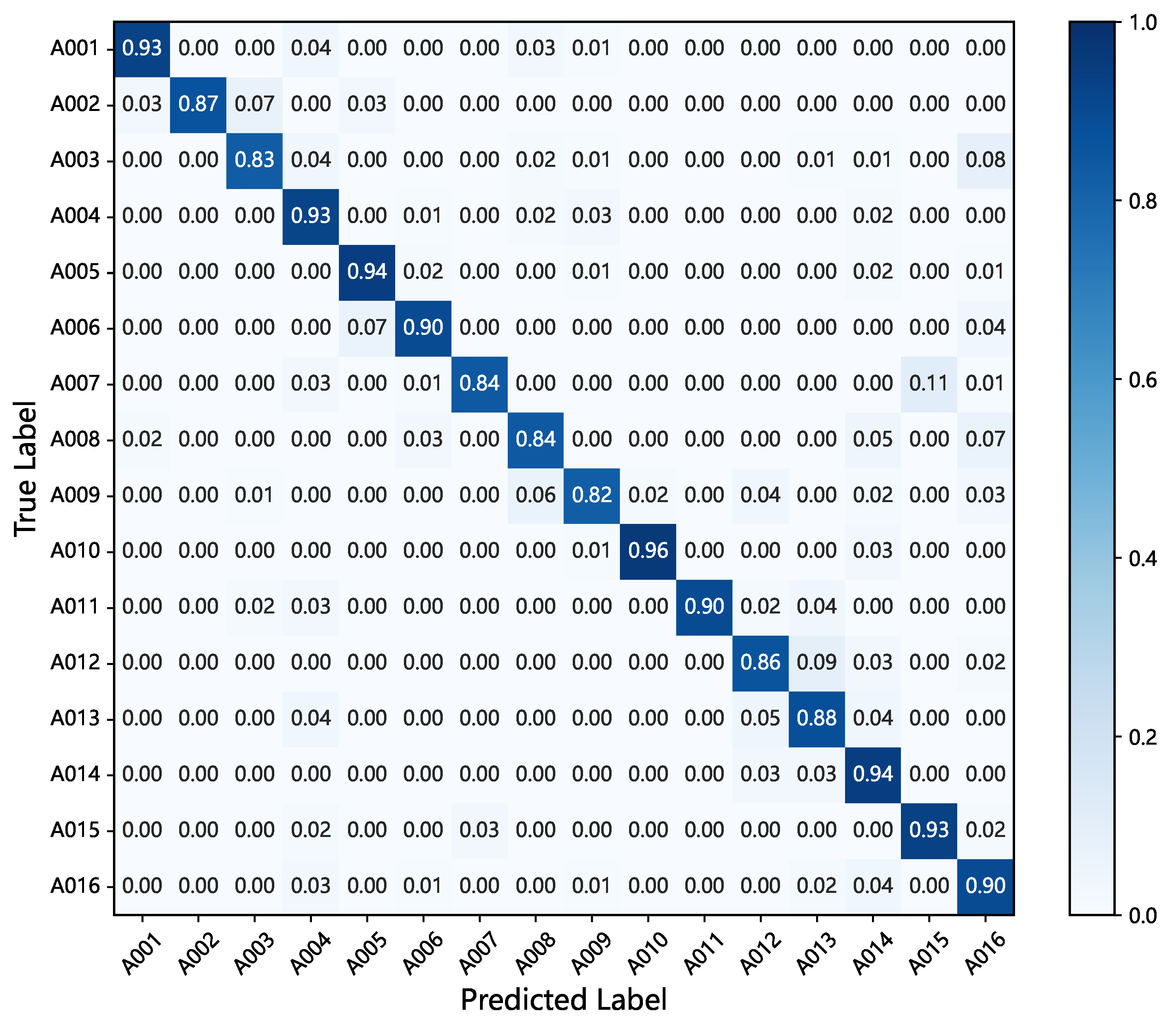 The confusion matrix of the recognition results.