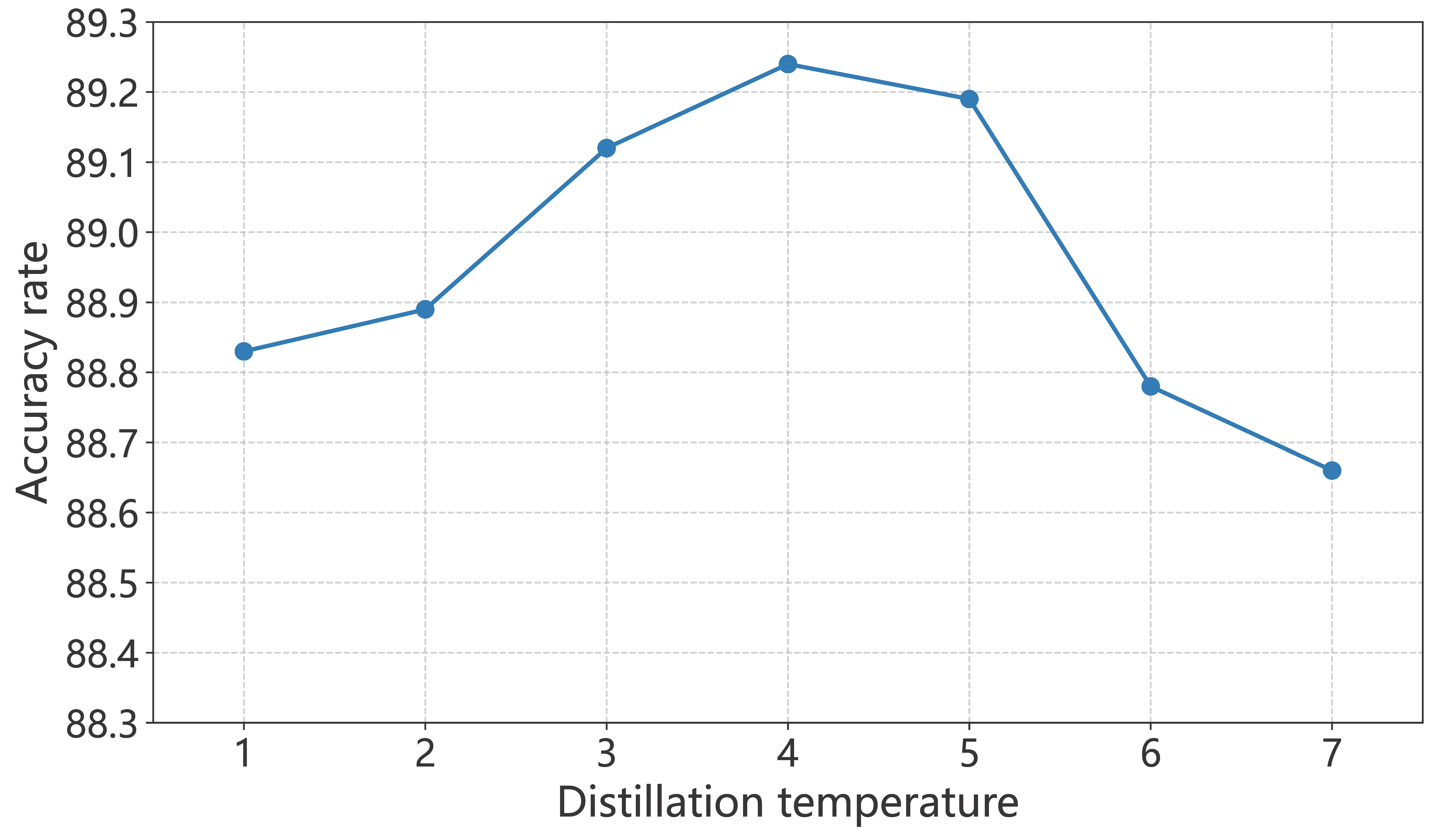 Recognition accuracy curve under different distillation temperatures.
