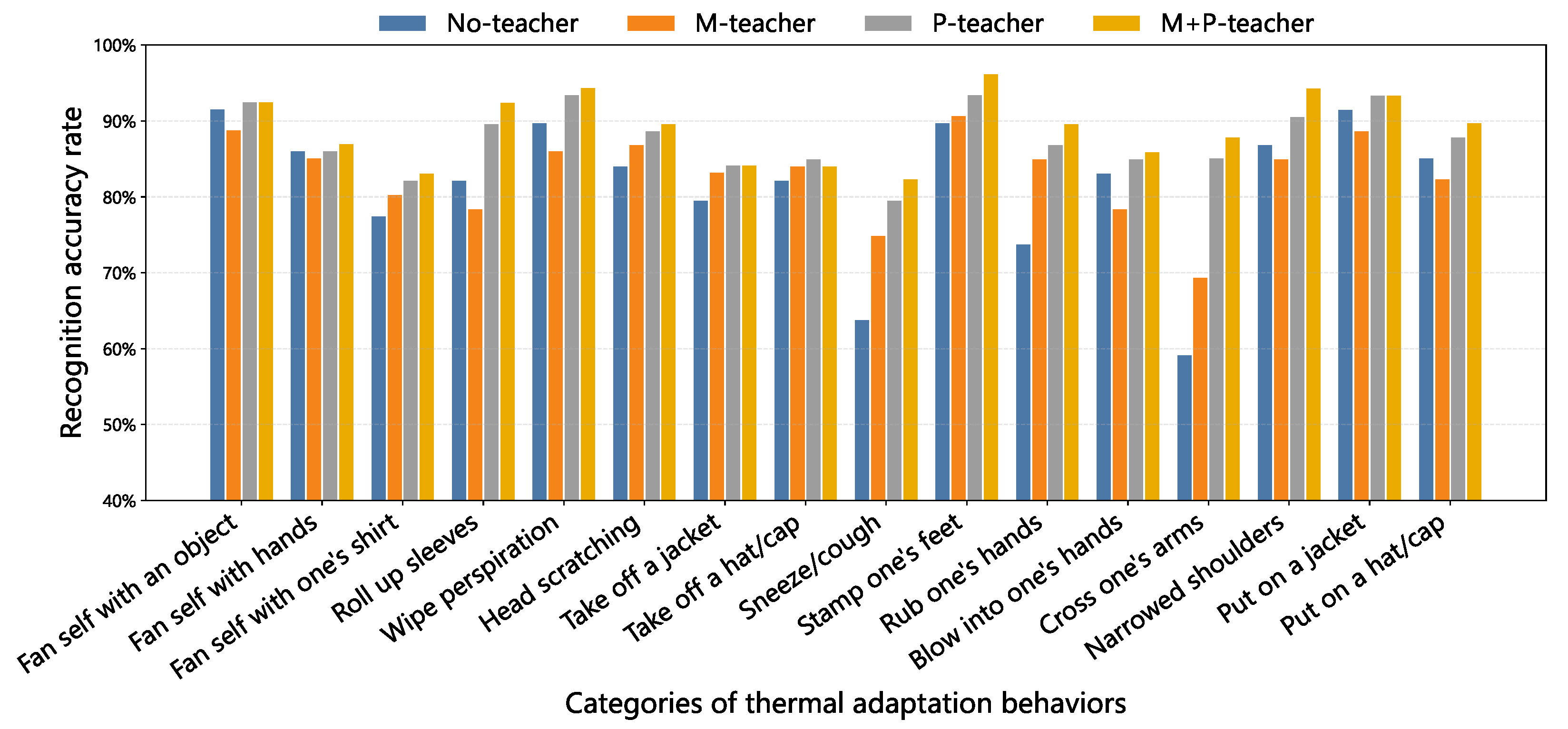 Comparison of recognition accuracy for various thermal adaptation behaviors among different teacher network models.