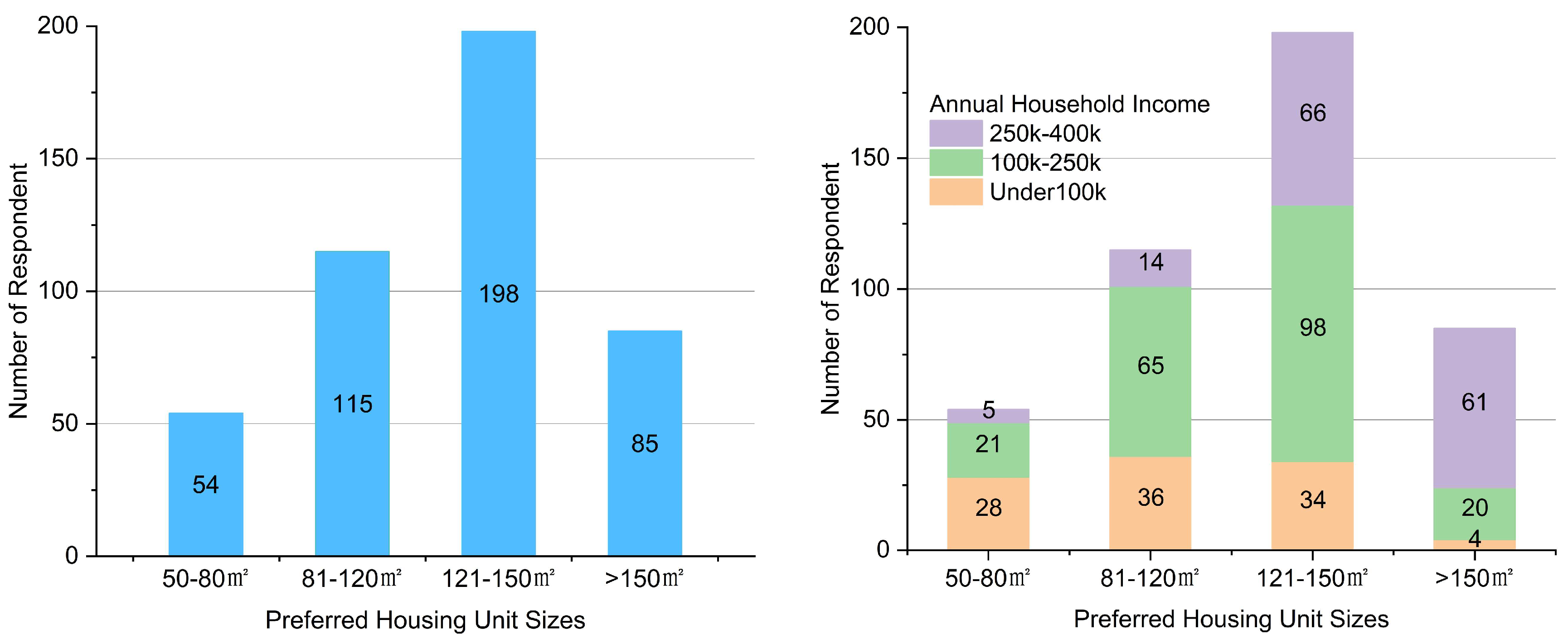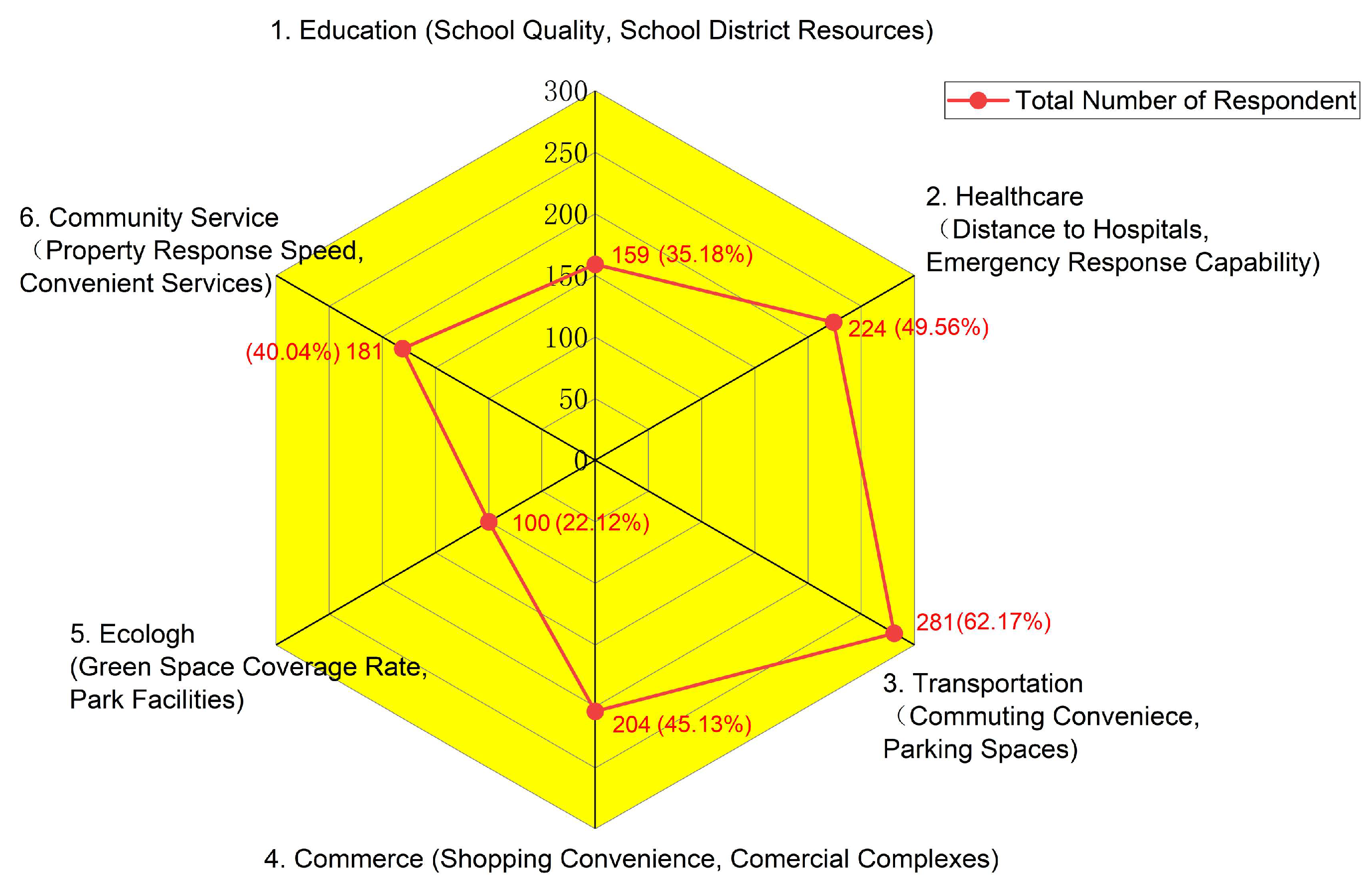 - Income (economic constraints) and family structure (spatial needs) are the core driving factors for “hard needs” such as house type and parking space, and their influence intensity can be quantified through regression coefficients (e.g., β = 0.82 for the impact of income on house type preference);