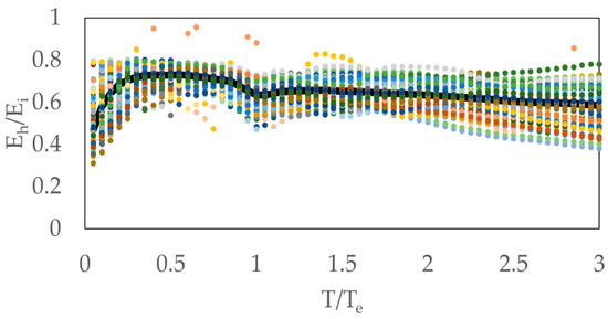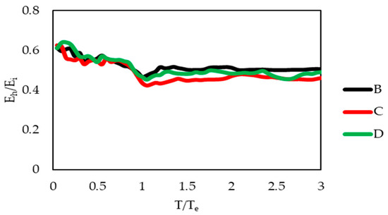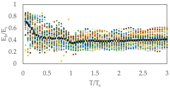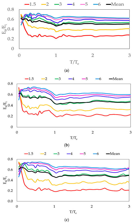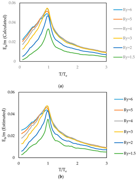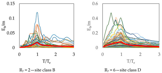 Figure 3, Figure 4 and Figure 5 show that the normalized energy–normalized period relationship has a lower dispersion. Figure 6 shows the mean hysteretic energy ratio of each site class.