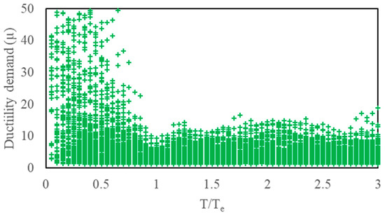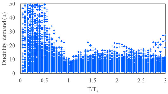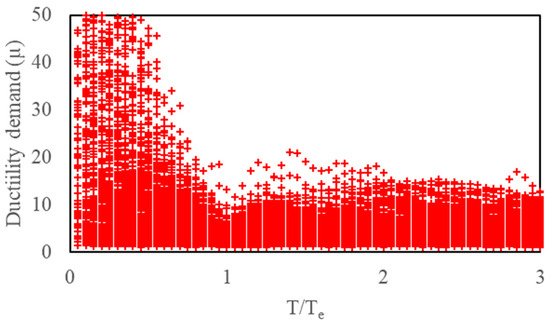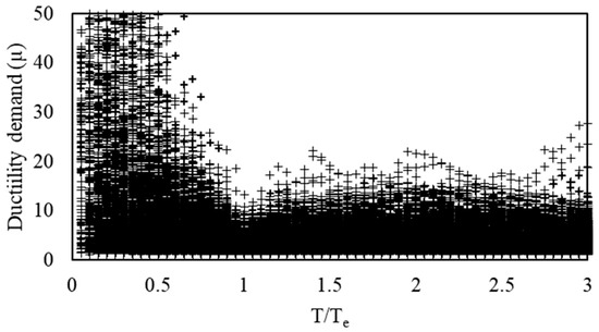β3 is T/Te, which shows the ratio of the period of the SDOF system and the characteristic period of ground motion, which is given with Equation (8). A regression analysis was performed comparing the ductility demands calculated by nonlinear time history analyses with those obtained by the proposed regression model. Relatively high ductility demands are observed under some earthquake ground excitation, especially for SDOF systems with periods of vibration shorter than 0.3 s. This manner causes extremely high deviations in the related period range. In order to compensate for the effect of these deviations, the weighted least squares loss function L was taken as follows: