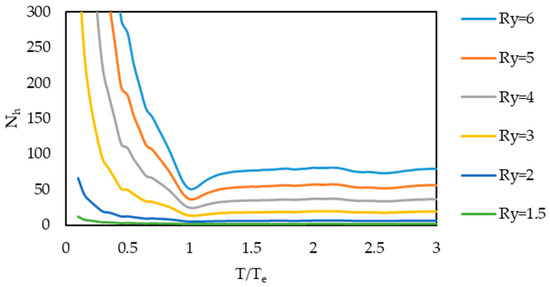 PSA refers to the elastic pseudo-spectral acceleration; SD denotes the spectral displacement. The normalized cyclic energy defined in Equation (15) corresponds to the normalized absorbed energy introduced by Chou and Uang [49]. Since the recoverable deformation energy Es becomes zero at the end of the ground motion, the absorbed energy becomes equivalent to the cyclic energy. The mean hysteretic energy (Eh/m), mean normalized hysteretic (Nh) energy, and ductility demand (µ) spectra are shown in Figure 15. It is observed that the spectral shapes of the mean hysteretic energy (Eh/m) and ductility (µ) demands exhibit different trends, whereas the mean normalized hysteretic energy (Nh) spectrum shows a similar trend to that of the ductility demand spectrum. Figure 16 shows the mean normalized hysteretic energy for different strength levels of SDOF Systems.