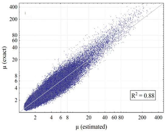 As a result of the regression analysis, Equation (11) is obtained. The proportion of variance accounted for by the model (R2) is calculated as 77%. The mean error, the weighted mean error, and the coefficient of variation of error are found as 0.005, 0.043, and 0.163, respectively.