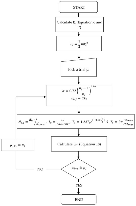 Equation (19) given above allows estimating the ductility demand in terms of the energy dissipated by the yielding of the SDOF system. Thus, a reliable estimation of the displacement ductility demand through the seismic energy should be obtained by performing an iterative procedure. The flow chart of the proposed iterative procedure is given in Figure 19 and summarized as follows: