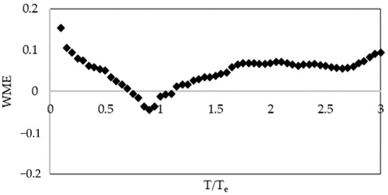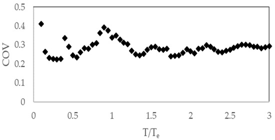 Figure 6 shows that the site class has no significant effect on the hysteretic energy dissipated by an SDOF system, unlike the input energy. However, the shape of the hysteretic energy spectrum is similar to the input energy spectrum’s shape, as is seen in Figure 2 and Figure 21. As it is shown in Figure 21, the strength reduction factor is significantly effective on hysteretic energy. This result stems from the fact that hysteretic energy is an indicator of structural damage and that structural damage is directly related to strength. Another parameter related to structural damage is the displacement demand caused by ground motion. Therefore, the obtained results indicate that a relationship can be established between hysteretic energy and displacement ductility demand of SDOF systems with a certain strength. The hysteretic energy reaches its maximum value when the period of the SDOF System is equal to Te. The weighted mean error (WME) and the coefficient of variation of error (COV) of Equation (12) are given in Figure 22 and Figure 23. As mentioned above, Ibarra et al. [36] concluded that degradation is effective only when the structural system approaches or reaches its collapse state. Given that the proposed method does not explicitly account for such degradation, it should be recognized that its accuracy may slightly decrease under near-collapse conditions. Furthermore, Vega and Montejo [50] observed that ground motion duration has a significant influence on damage at moderate damage levels; however, this effect diminishes at severe damage levels. Thus, ductility demands, which may cause moderate damage, would differ from those obtained with the proposed methodology.