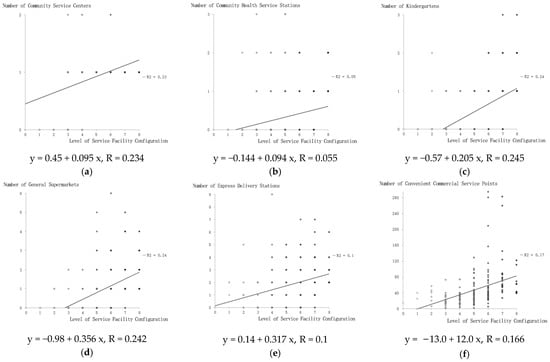(a) Correlation between configuration level and the number of community service centers; (b) Correlation between configuration level and the number of community health service stations; (c) Correlation between configuration level and the number of kindergartens; (d) Correlation between configuration level and the number of general supermarkets; (e) Correlation between configuration level and the number of express delivery stations; (f) Correlation between configuration level and the number of express delivery stations.