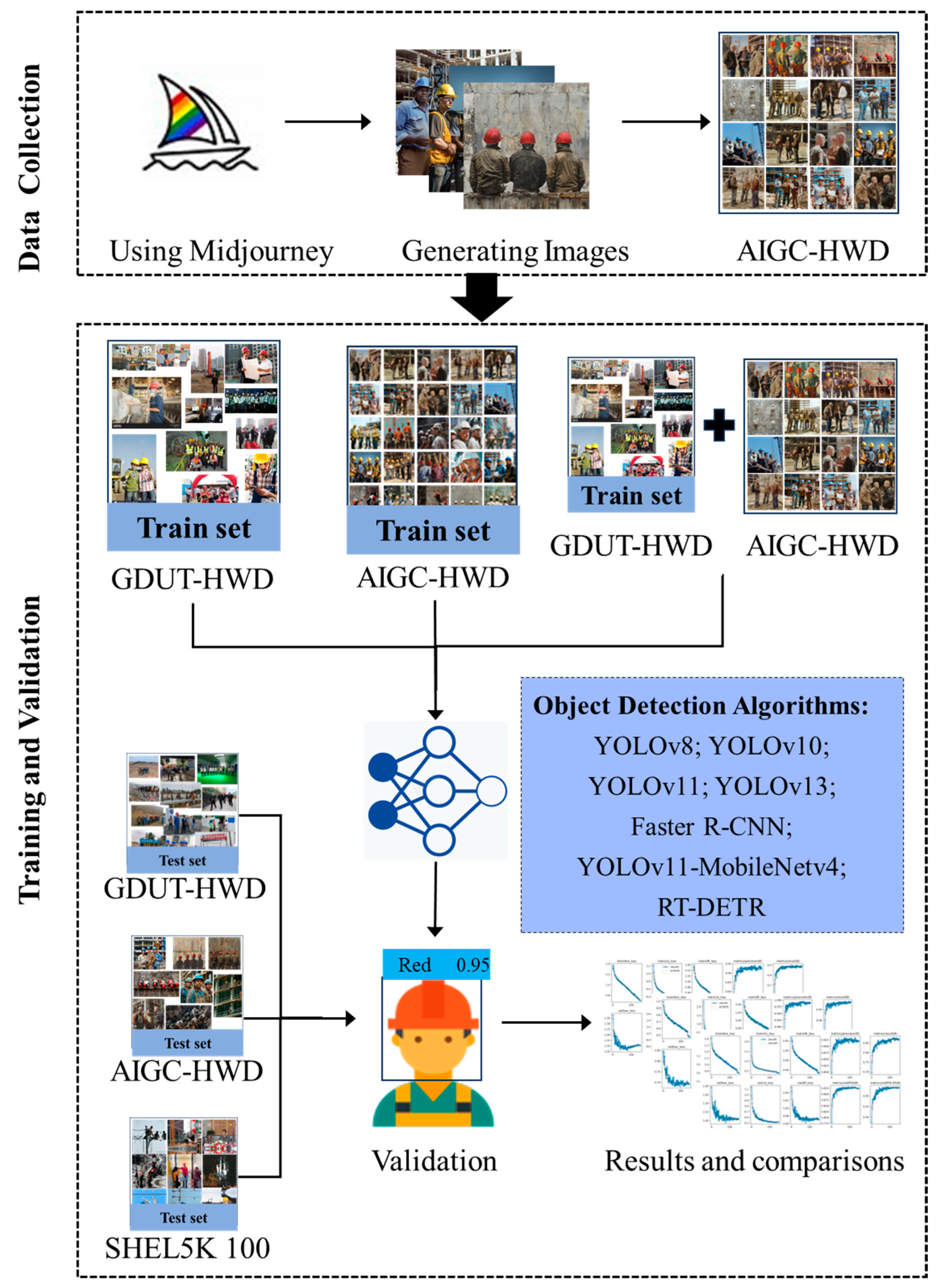 To this end, we propose a new helmet object detection dataset in which all images are generated using generative AI. This dataset, named AIGC-HWD (Artificial Intelligence-Generated Content—Helmet Wearing Detection), includes five categories: red helmet (red), white helmet (white), blue helmet (blue), yellow helmet (yellow), and no helmet (none). Models trained on this dataset can simultaneously detect helmet usage and classify individuals. To evaluate the practical effectiveness of models trained on this dataset and to assess whether generative AI images can effectively supplement real-world images through data augmentation, this paper conducts tests using multiple object detection algorithms.