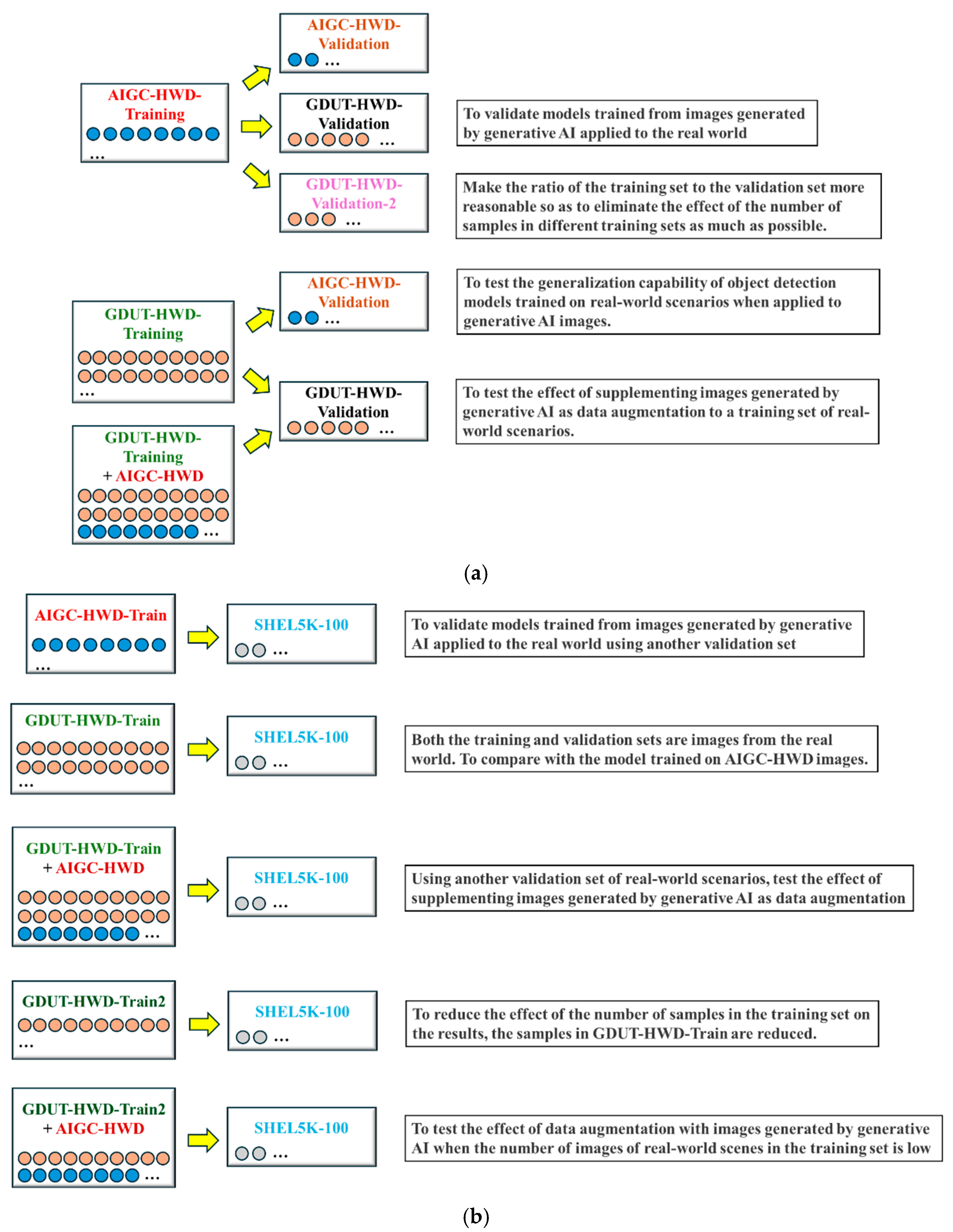 (4) To validate the effectiveness of generative AI-generated images as a data augmentation method, we first trained object detection models using the GDUT-HWD training set and evaluated them on the GDUT-HWD validation set. Subsequently, we augmented the GDUT-HWD training set by incorporating all AIGC-HWD images and compared the results with those obtained from the original training set.