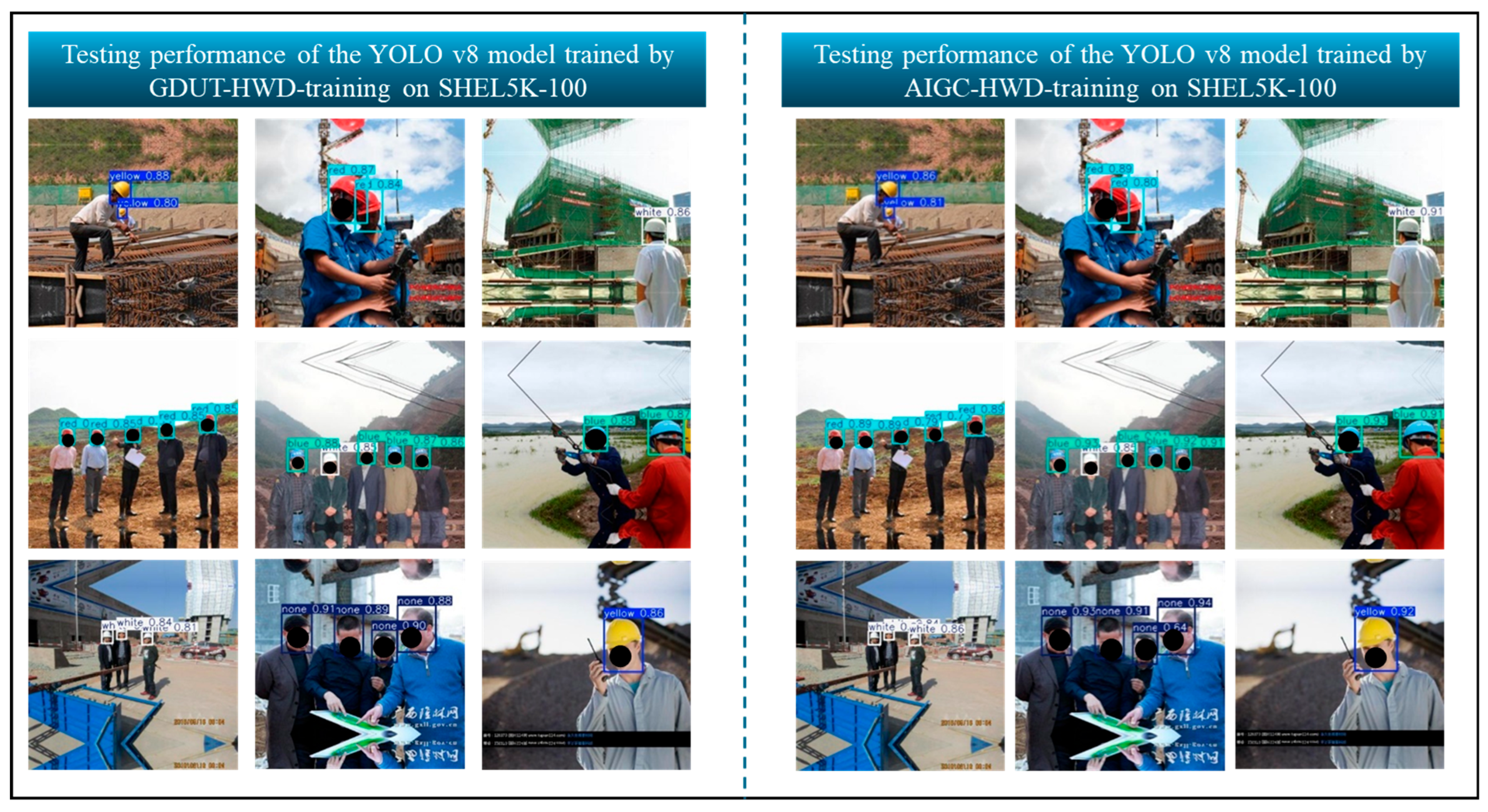 In general, different helmet colors on construction sites correspond to different categories of individuals. Therefore, recognizing helmet color in addition to detecting helmet usage can support personnel classification. Based on this need, Wu et al. [9] established a dataset named GDUT-HWD, which consists of 3174 images collected under various site conditions, covering a range of scenes, lighting environments, and occlusions. The dataset includes annotations only for head regions and defines five classes: Red, White, Yellow, Blue, and None, where “None” represents the absence of a helmet. The GDUT-HWD dataset has been used by Liu et al. [13] and Zhang et al. [16] to validate their proposed object detection algorithms.