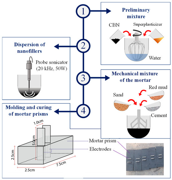 As shown in Figure 2, water, superplasticizer, and CBN were first mixed. Subsequently, the dispersion of the nanomaterials was performed using a probe sonicator operating at 20 kHz and 50 W, with a sonication time proportional to the solution volume (0.08 min/cm3), as adopted by Lima et al. [44]. During this process, the superplasticizer acted as a dispersing agent. Next, the dry mixture composed of cement, RM, and/or sand was gradually incorporated into the solution over a period of 5 min. After 10 min of continuous mixing, the resulting fresh mortar was cast into prismatic and cubic molds previously covered with a thin layer of mineral oil and subsequently compacted on a vibrating table for 10 s. During the casting stage, five prismatic specimens were instrumented with two Kanthal KA1 electrodes positioned with a spacing of approximately 1 cm and measuring 1.5 cm × 5 cm × 0.15 cm. After casting, the specimens were subjected to wet curing for 28 days at 23 ± 2 °C, followed by heating in an oven at 50–70 °C for 5 days and cooling to room temperature to minimize potential interferences from ionic conduction during the electromechanical tests [45,46].