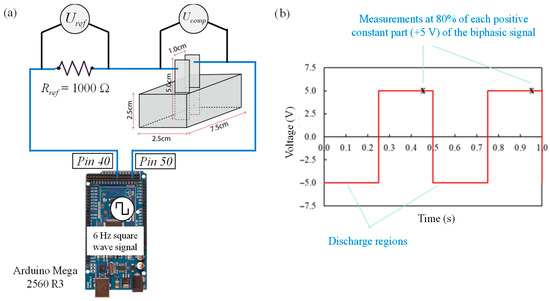The initial electrical resistivity of the specimens, corresponding to the unloaded state, was determined using the biphasic direct current (DC) method proposed by Downey et al. [51], as a replacement for the conventional DC procedure, in order to minimize potential polarization effects. For signal generation, an Arduino Mega 2560 R3 board was programmed to produce a periodic square wave with a frequency of 6 Hz, voltage of ±5 V, and a duty cycle of 50%, as reported in previous studies [13,52]. The experimental setup is illustrated in Figure 3a.