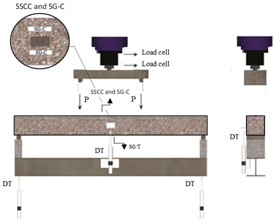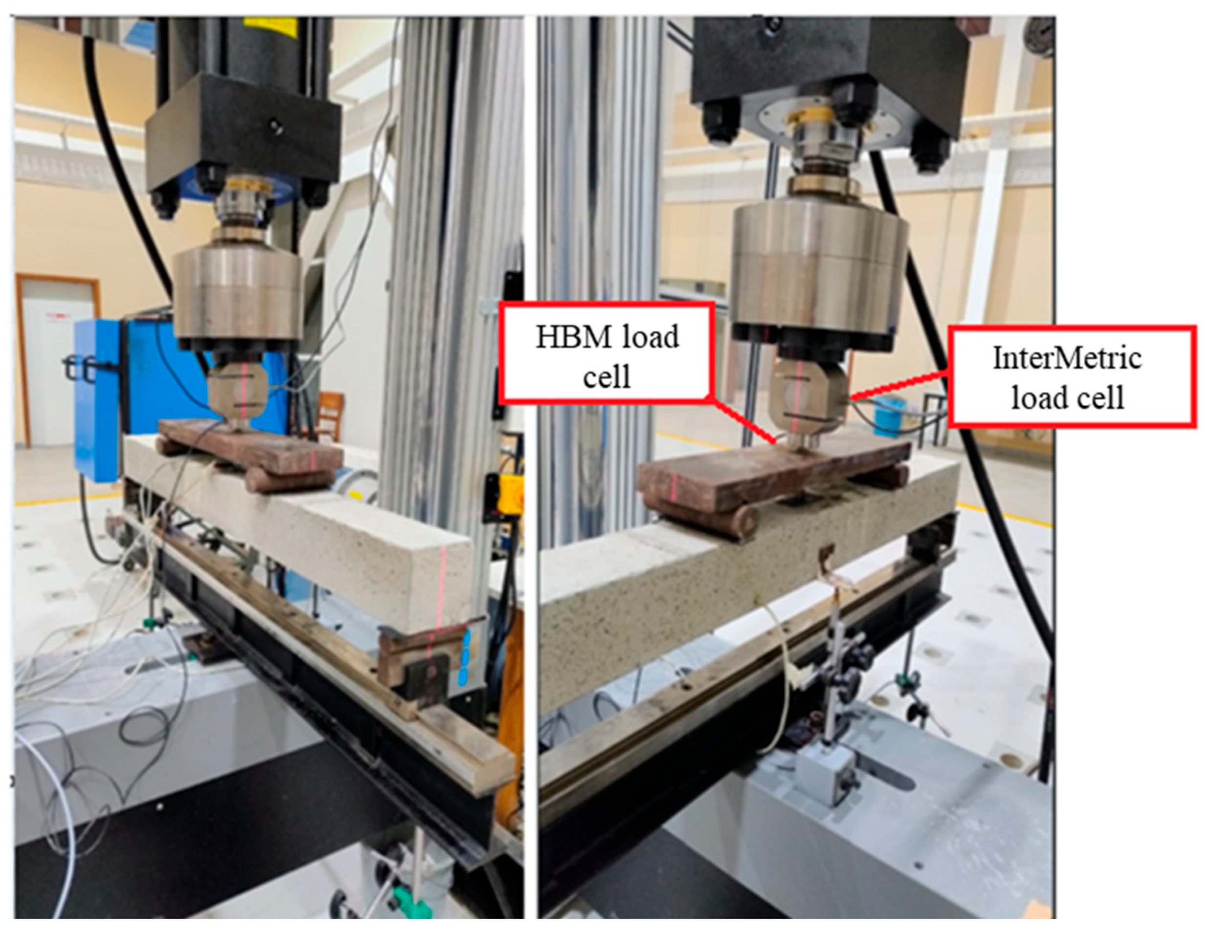 For the application of dynamic loading, the assembly (beam + SSCC) was positioned along the axis of an InterMetric universal testing machine, model IM-750, on a pre-installed steel reaction beam. The cementitious sensor was located at the midspan on the upper face of the beam to monitor the compression zone during loading. Using a four-point bending test configuration, the beam was subjected to cyclic loading at 20 cycles/min. The load application points were located 30.0 cm from the axis line of the supports. A displacement transducer (DT) HBM, model WA20, was positioned at the midspan of the beam to record deflection throughout the test. At the ends of the reaction beam, two additional DTs of the same model were also installed to monitor any undesired movement, allowing compensation if necessary. Furthermore, two commercial concrete strain gauges (SG-C) with a GF of 2.15 were attached to the top surface at the midspan of the beam, enabling the monitoring of strains and comparison with SSCC measurements. Between the actuator of the universal testing machine and the beam, an HBM load cell, model C9C, with a capacity of 50 kN was installed. This configuration allowed monitoring and recording of the applied load throughout the test. Data acquisition from the load cell, strain gauges (for steel and concrete), and DTs was performed using an HBM Quantum X system with MX840A and MX1615 modules, linked to the Catman data acquisition software. The InterMetric universal testing machine was controlled via Tesc software implemented on the integrated computer, enabling automated control of the load cycles throughout the test. Figure 6 and Figure 7 illustrate the experimental setup used in the bending tests of the RC beams.