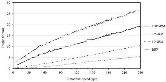 The same experimental procedure used by Carvalho et al. [48] was used, with minor adaptations to meet the specific requirements of the present study: initially, the rotational speed was increased from 0 to 240 rpm over 30 s; then, the 240 rpm plateau was maintained for 600 s to stabilize the system; finally, the speed was decreased back to 0 rpm over 30 s, at which point torque and rotational speed measurements were performed.