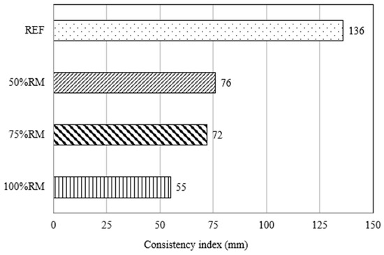 Consistency index of cementitious composites with different contents of RM. Adapted from Oliveira et al. [40], Copyright 2025, with permission from Springer.