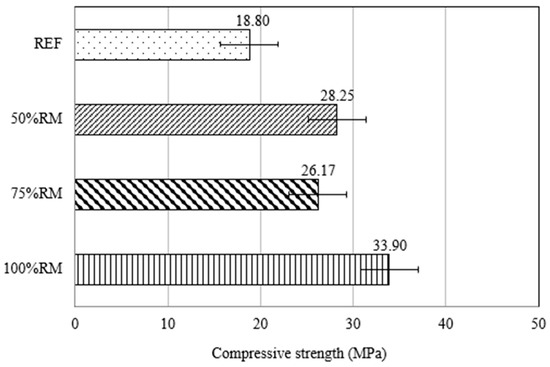 Results of compressive strength of cementitious composites with different contents of RM. Adapted from Oliveira et al. [40], Copyright 2025, with permission from Springer.