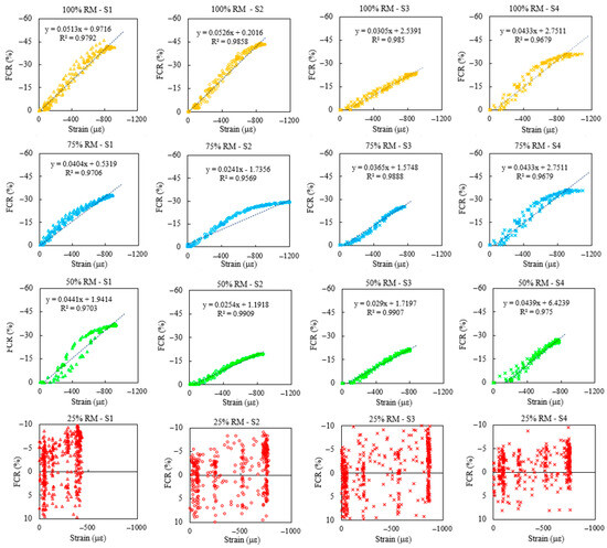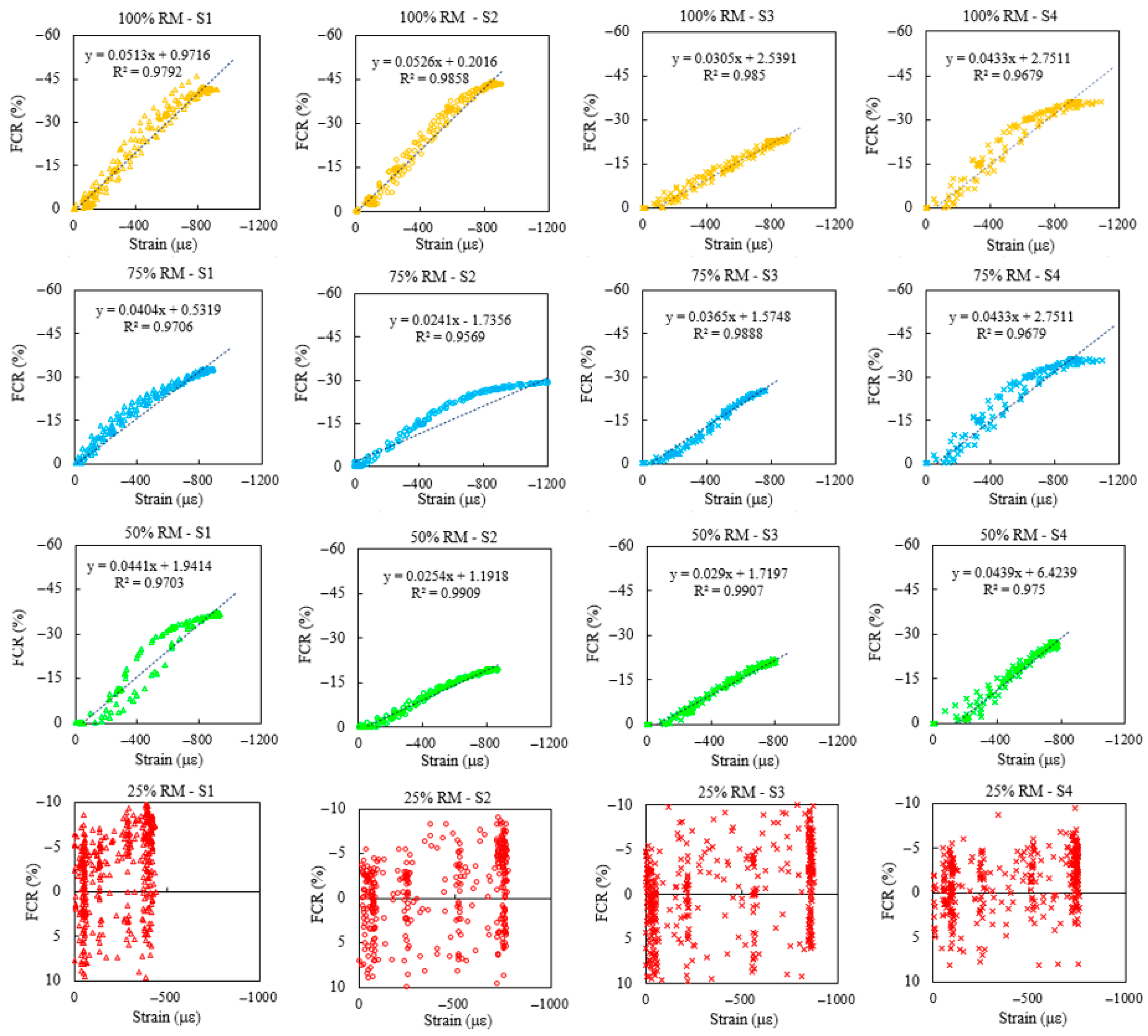 By examining the FCR values throughout the test, it can be observed that the behavior of the cementitious sensor follows the variations in force and strain measured by the commercial electrical extensometers, demonstrating a satisfactory sensing performance of the material under dynamic analysis. It is also noted that during each unloading stage, the material’s electrical resistivity recovers, indicating an appropriate piezoresistive performance of the cementitious sensor.