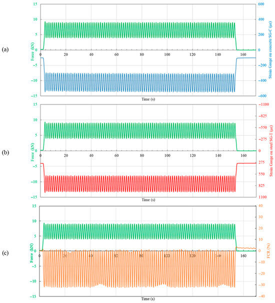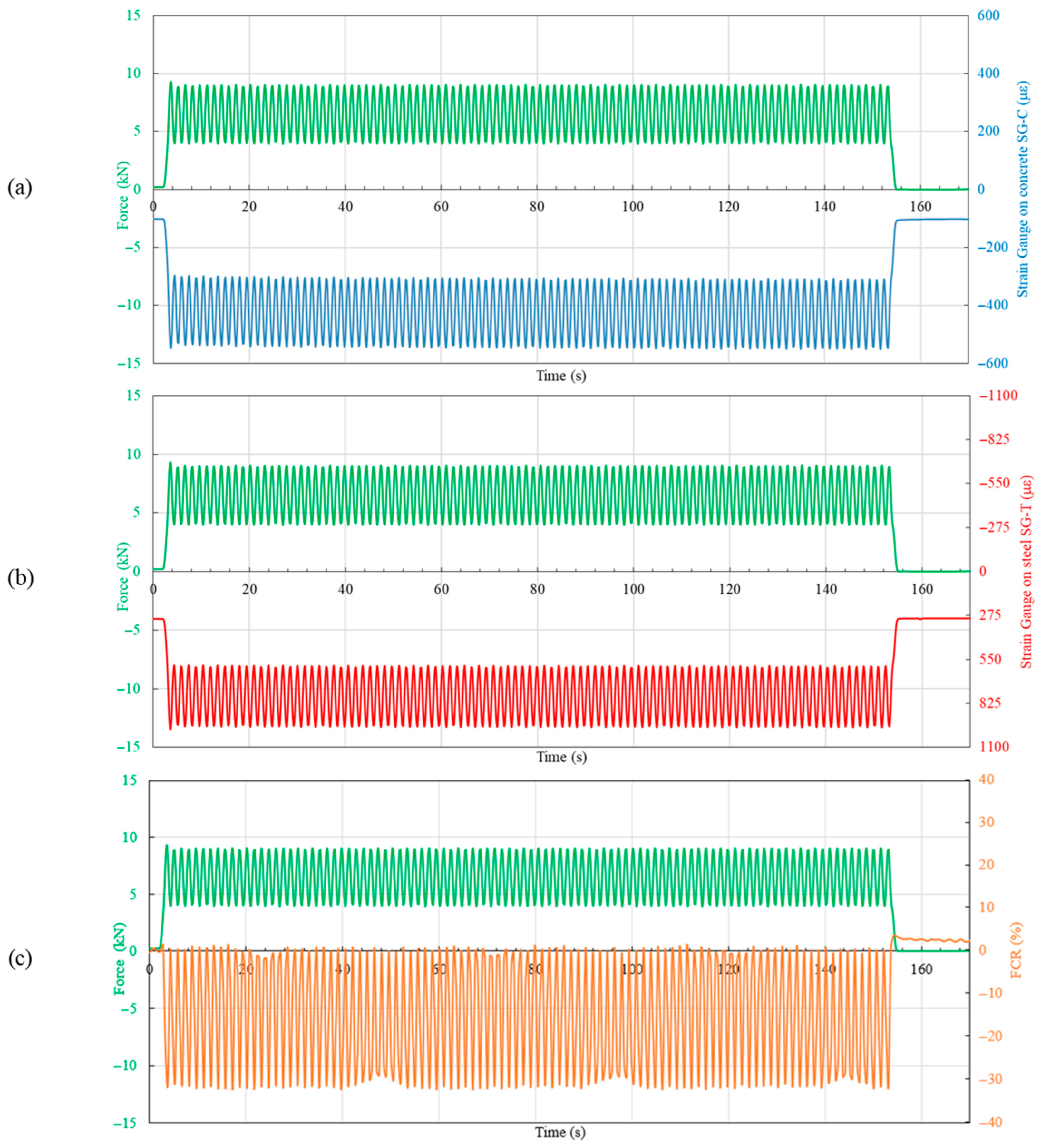 Results of the dynamic analysis: (a) Average concrete strain vs. applied load in the loading/unloading cycles over time, (b) Average steel strain vs. applied load in the loading/unloading cycles over time, (c) FCR vs. applied load in the loading/unloading cycles over time.