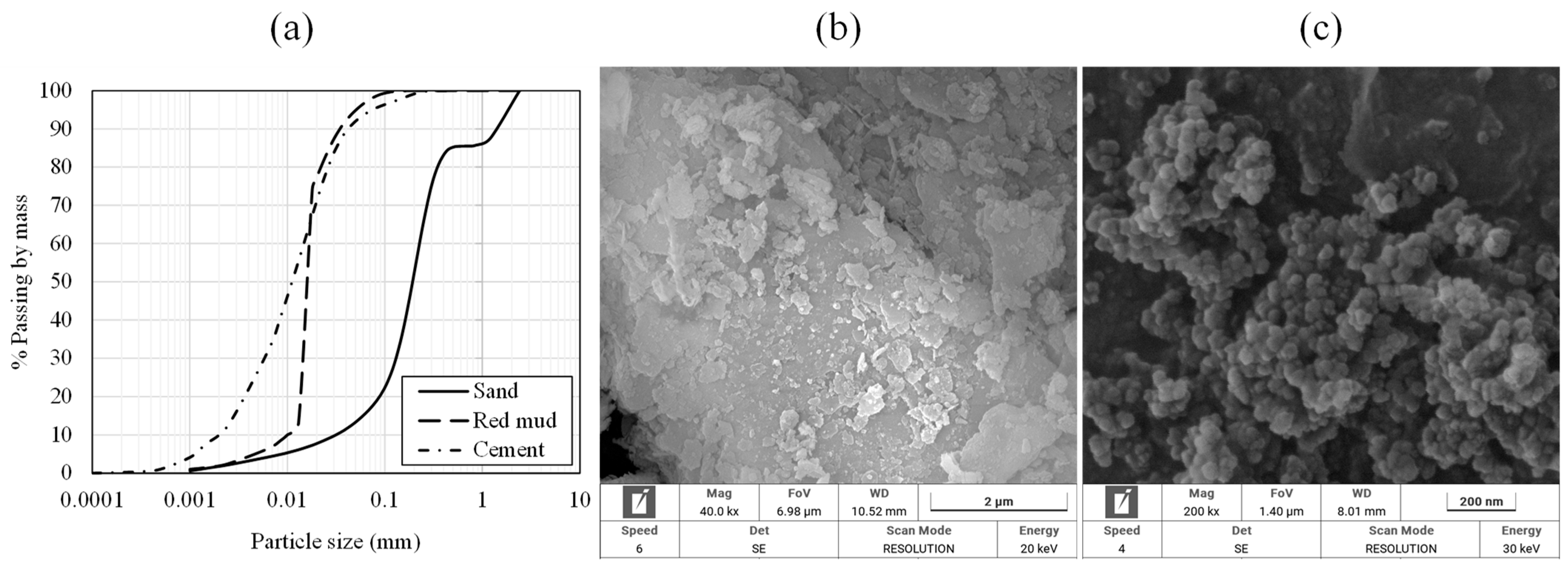 Characterization of raw materials: (a) particle size distribution curves (adapted from Oliveira et al. [40], Copyright 2025, with permission from Springer); (b) micrograph of red mud (RM) sample and (c) carbon black nanoparticles (CBN) sample obtained by field emission gun scanning electron microscopy (FEG-SEM).
