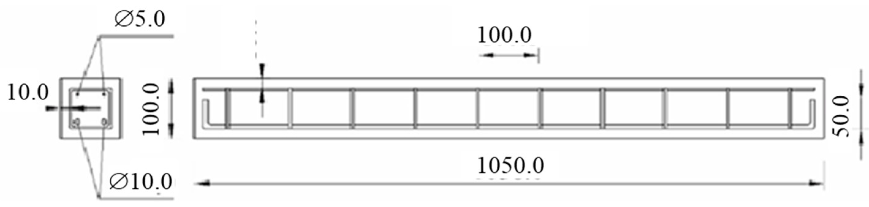 The beam was designed to exhibit a failure mode characterized by excessive deformation of the steel reinforcement. The experimental model was produced with nominal dimensions of 10 × 10 × 105 cm, with an effective span of 100.0 cm in the four-point bending test. The longitudinal tensile reinforcement consisted of two CA-50 steel bars with a diameter of Ø10.0 mm. The longitudinal compressive reinforcement consisted of two CA-60 steel bars with a diameter of Ø5.0 mm. For the transverse reinforcement, CA-60 bars with a diameter of Ø5.0 mm were used, spaced at 10.0 cm intervals. The concrete cover to the steel reinforcement was 1.0 cm. Figure 4 shows the steel reinforcement of the experimental model. The yield and ultimate strengths of the steel bars are presented in Table 4.