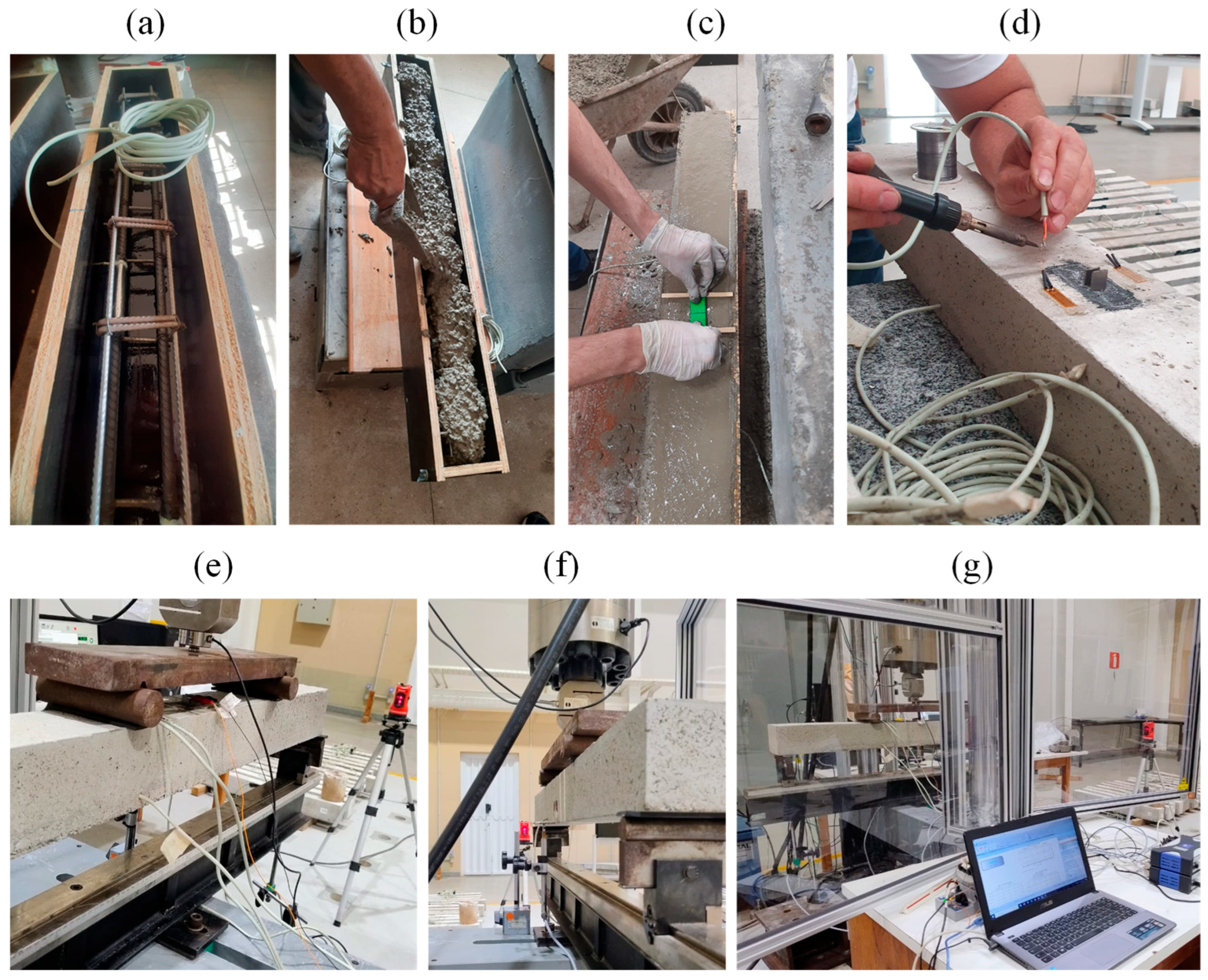 Procedures for beam production and testing: (a) preparation of the formwork and steel reinforcement; (b) concrete casting; (c) placement of spacer; (d) installation of the self-sensing region and conventional strain gauges; (e) alignment of the beam in the testing machine; (f) positioning of the LVDTs; (g) assembly of data acquisition systems.