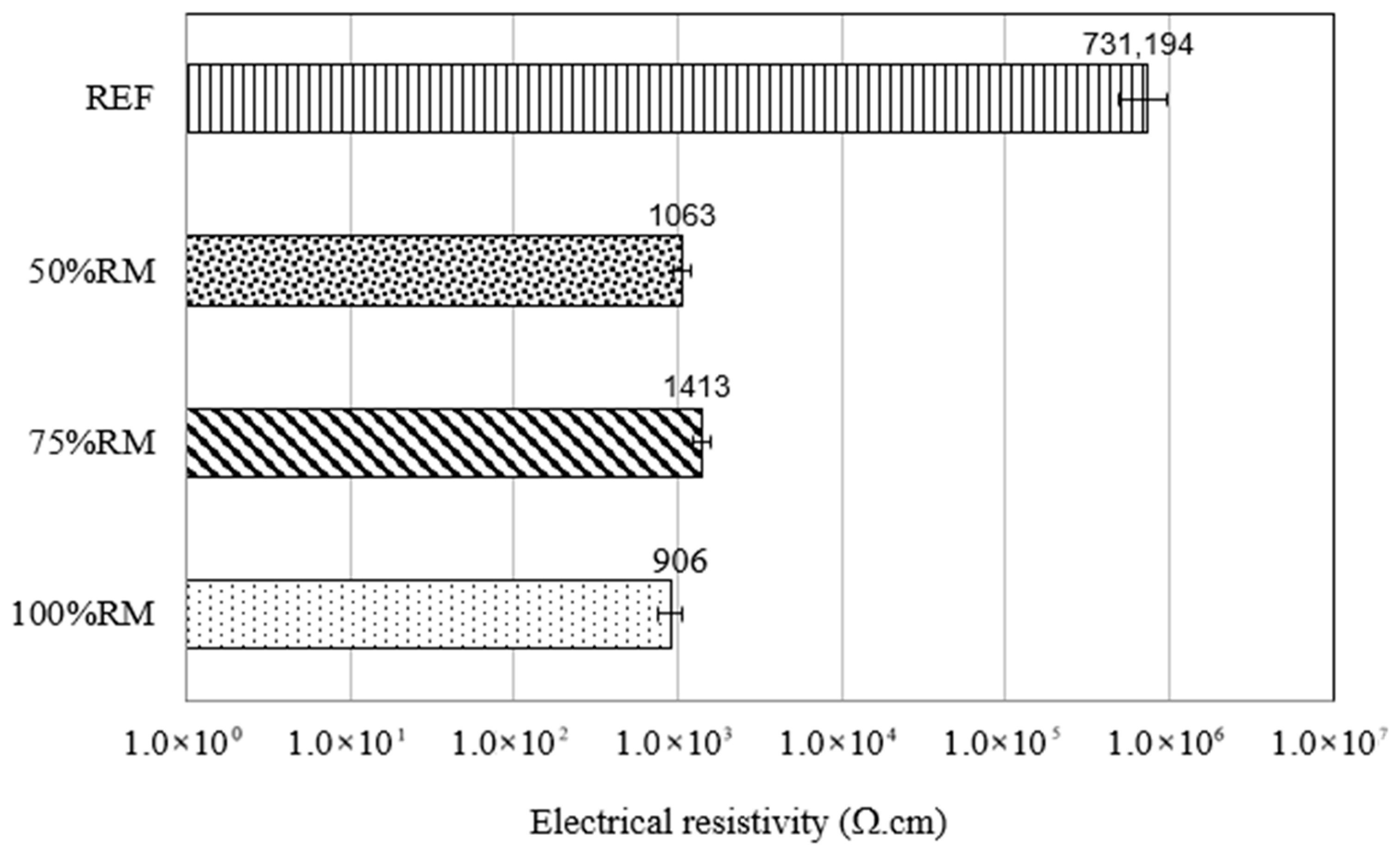 In the literature, studies addressing the use of RM in cementitious composites with a focus on their electrical and piezoresistive properties remain scarce. The electrical resistivity of RM-based concrete with various moisture contents was investigated by Raghu and Kondraivendhan [33]. Specimens containing RM exhibited lower values of electrical resistivity than control specimens without RM. According to the experimental results obtained by Ribeiro et al. [34,35], cement-based materials with RM presented higher values of electrical resistivity in a humid environment than reference samples without waste. After drying procedures, specimens containing RM exhibited values of electrical lower than the control specimens. Previous studies attribute the reduction in electrical resistivity of cementitious composites to the presence of highly conductive ions in RM, such as Na+, OH−, Ca2+, and K+, as well as its high content of metallic oxides, such as Fe2O3, which enhance electrical conductivity in cementitious matrices.