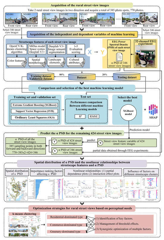 - This study successfully addressed the challenge of nonlinear modeling in traditional EEG-based landscape perception research caused by small sample sizes (e.g., n = 3 [59], 4 [12], 10 [16,57], 20 [60], 36 [61]). By increasing the sample size to 346, the study leveraged larger datasets as a foundation for nonlinear modeling. We employed Support Vector Regression (SVR) and eXtreme Gradient Boosting (XGBoost) alongside linear models (OLS) for comparison. The XGBoost model, selected for its optimal predictive performance, revealed the nonlinear mechanisms linking traditional village streetscape features and perception (α PSD). This approach overcomes the limitation of conventional linear models in streetscape research, which primarily identify correlations or variable importance.