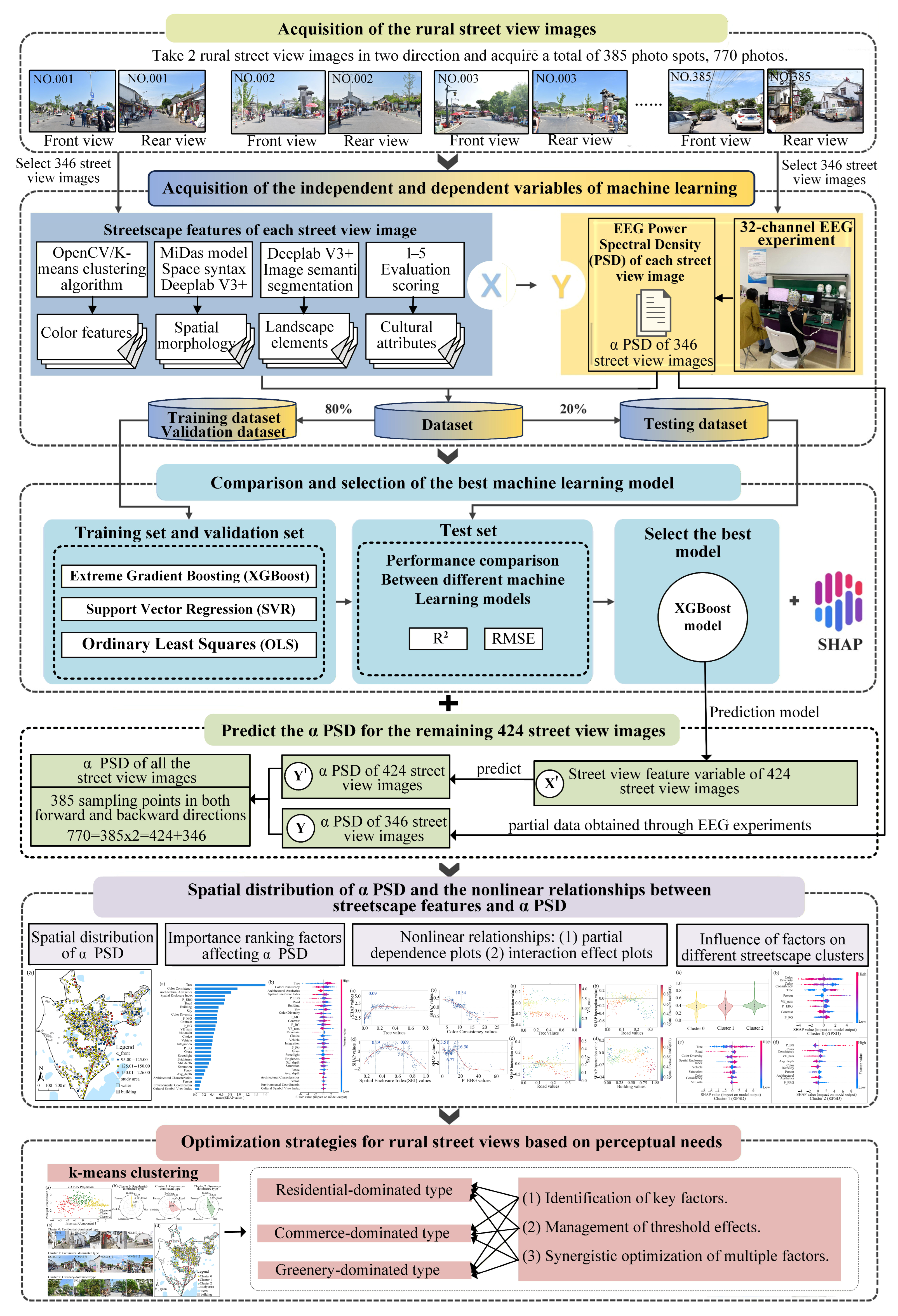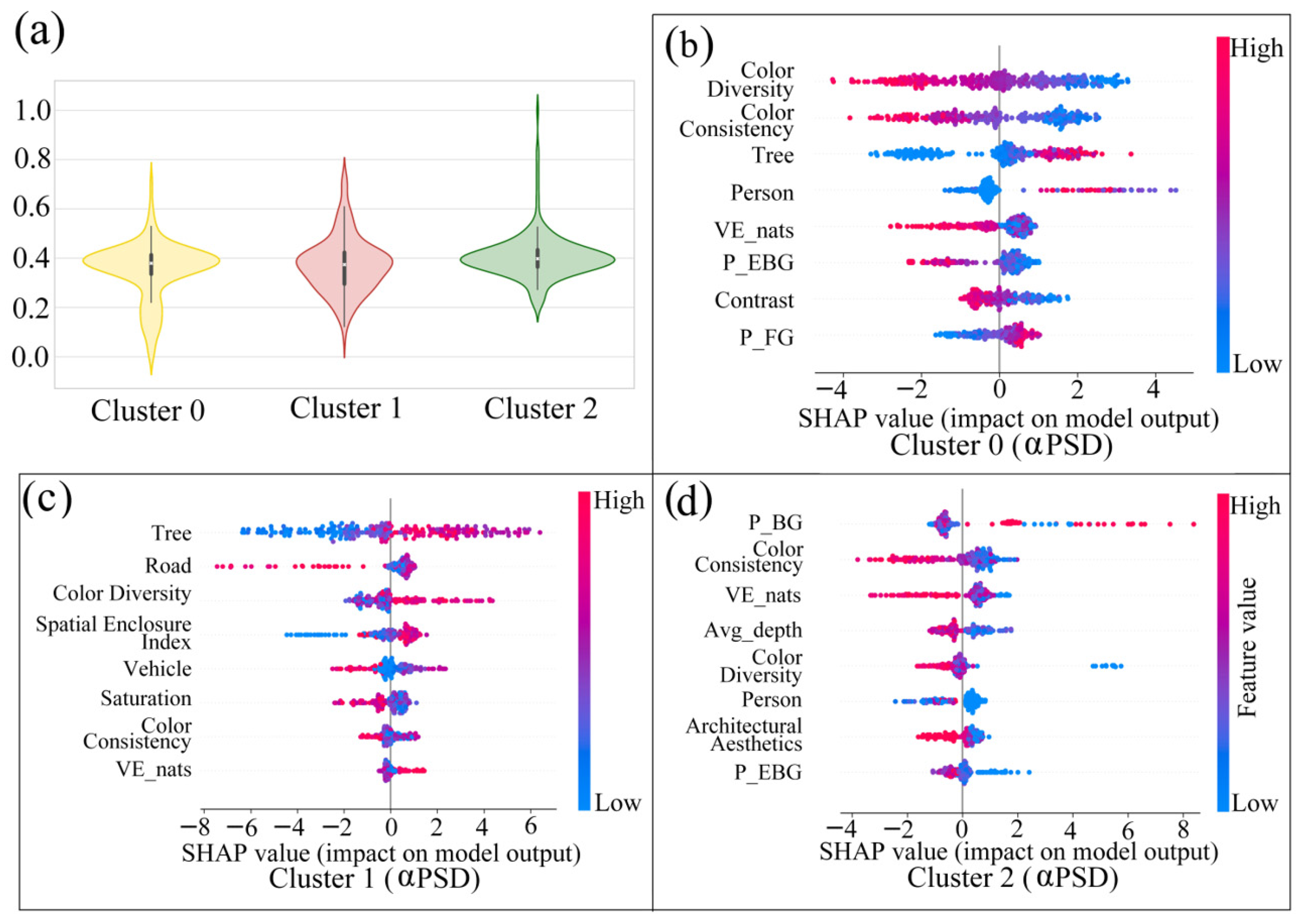 - Finally, combining SHAP interpretability analysis with k-means clustering, we established an analytical paradigm integrating global explanation and cluster-specific differences. Based on the “key factor identification—threshold effect control—multi-factor synergistic optimization” approach, we proposed rural streetscape design strategies to modulate α PSD, promoting relaxation and calm responses.