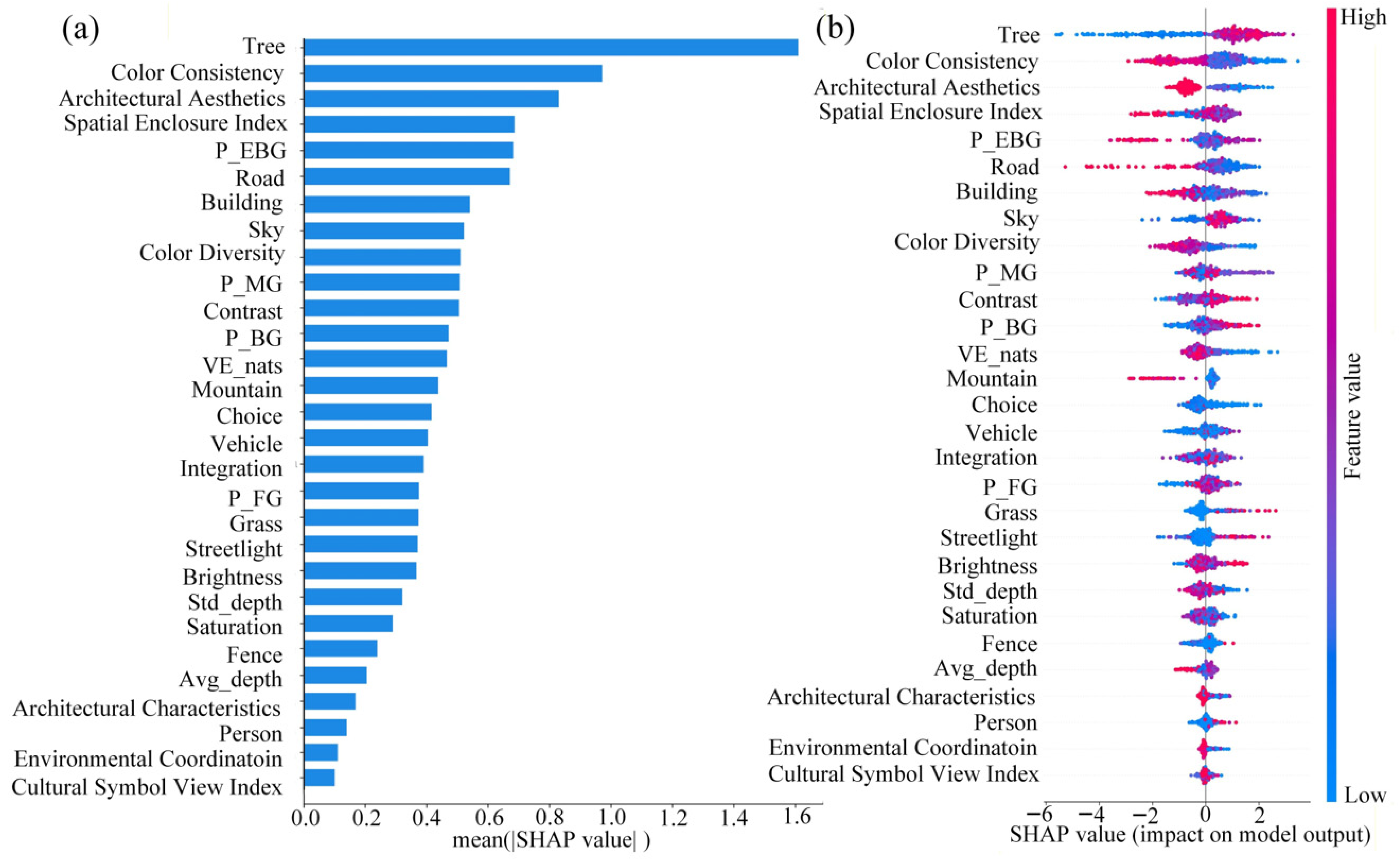 - The key streetscape features affecting rural streetscape α PSD, in order of importance, are tree, color consistency, architectural aesthetics, spatial enclosure index (SEI), P_EBG, and road.