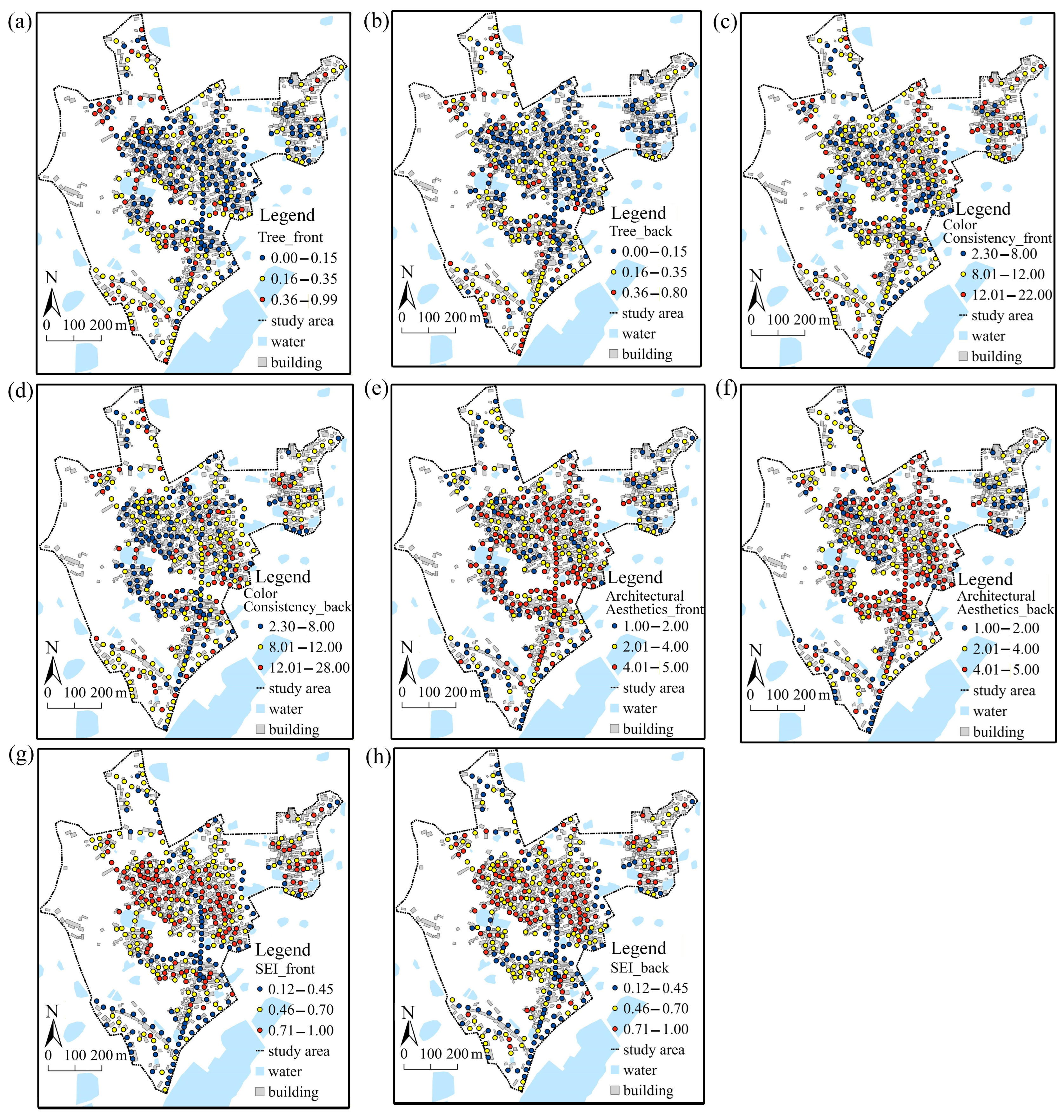 | Cultural attributes | 26 | Environmental coordination | 32 experts scored on sanitation, deterioration, orderliness, and material coherence using a 1–5 scale. | |