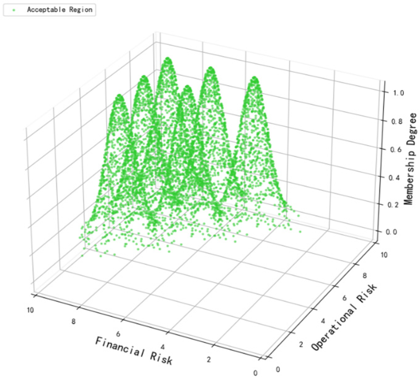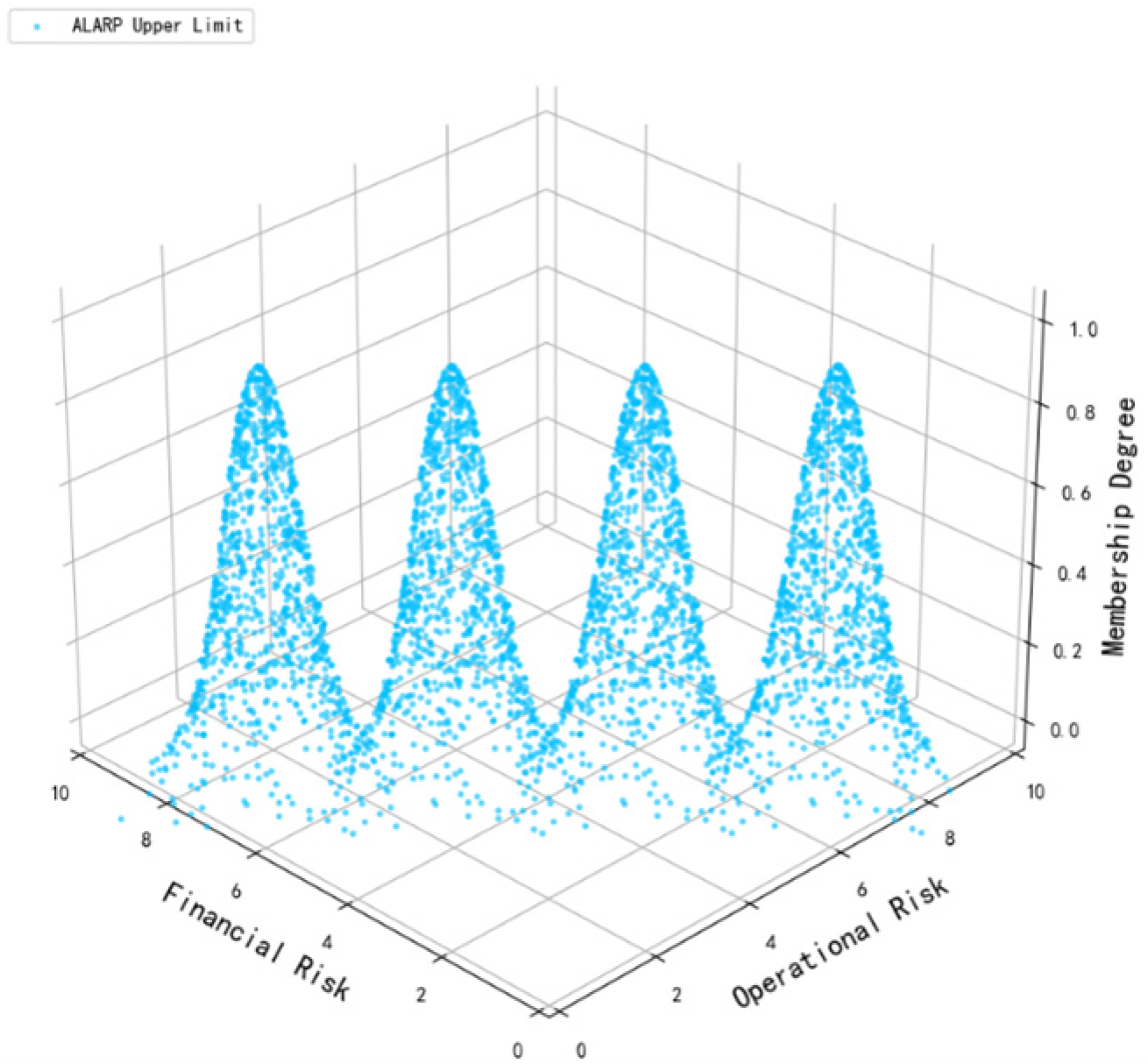 (1) Construction of credit risk standard cloud map: The standard cloud is constructed based on established evaluation criteria and corresponding digital characteristics. The evaluation criteria require risk level classification from both financial risk and operational risk dimensions, which are characterized by linguistic descriptions and corresponding quantized segmented scores. The ALARP risk criterion is applied to determine the comprehensive risk level. Currently, credit risk is divided into five levels: high risk, relatively high risk, moderate risk, relatively low risk, and low risk, corresponding to quantized segmented scores [0–10]. To reduce the subjectivity of manual risk level classification, the boundary values of the quantized interval [