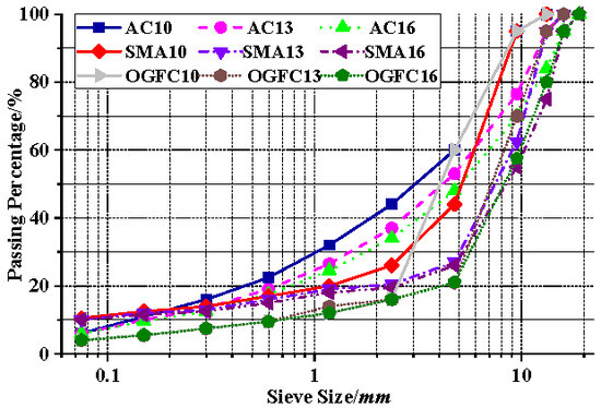 Different aggregate gradations of asphalt mixtures.